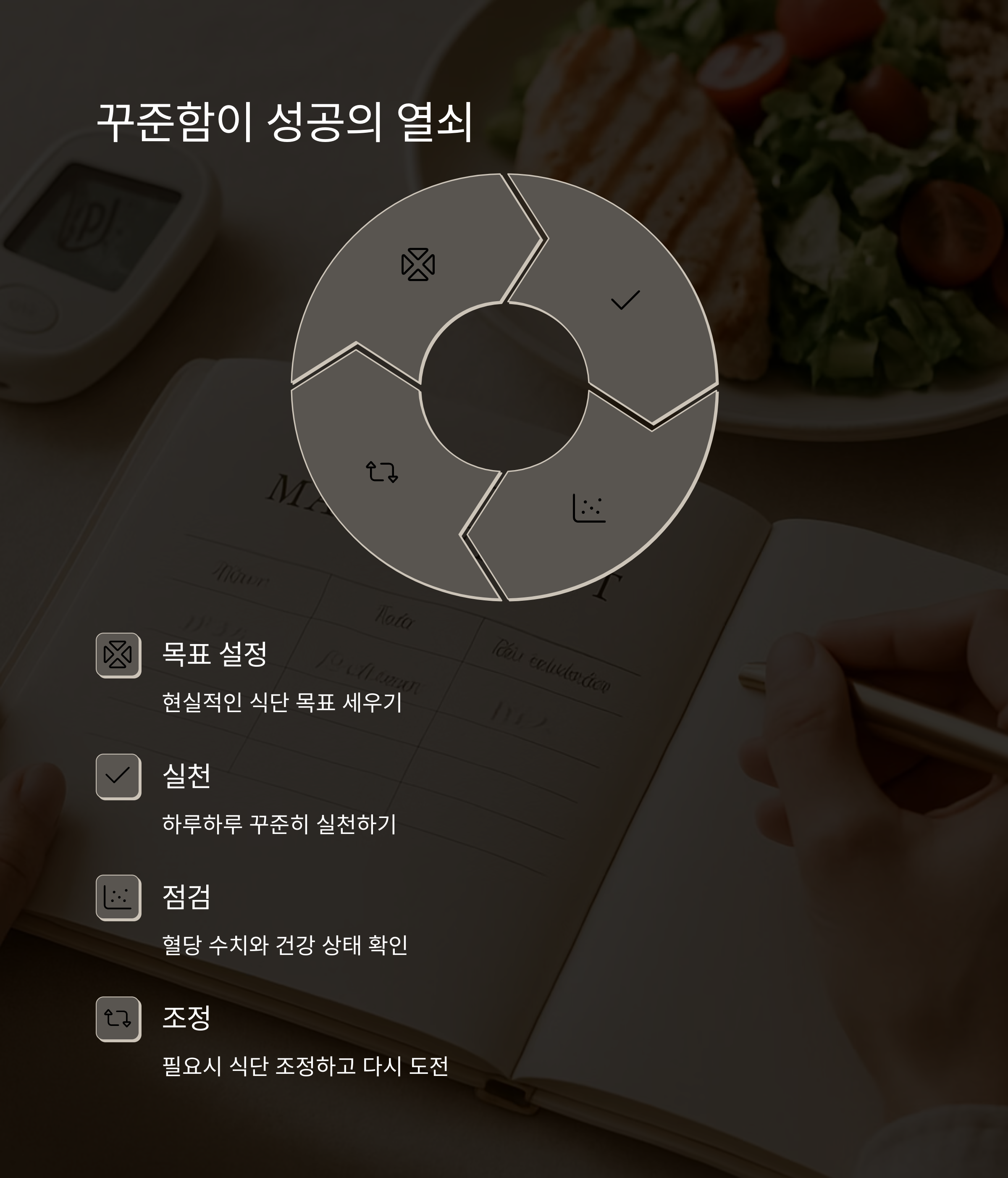 당뇨병 식이요법 관리 계획은 나에게 맞춰야 효과적이에요. 본인의 식습관과 라이프스타일, 그리고 건강 상태를 고려해서 계획을 세워야 하며, 전문가의 도움을 받는 것이 좋습니다.