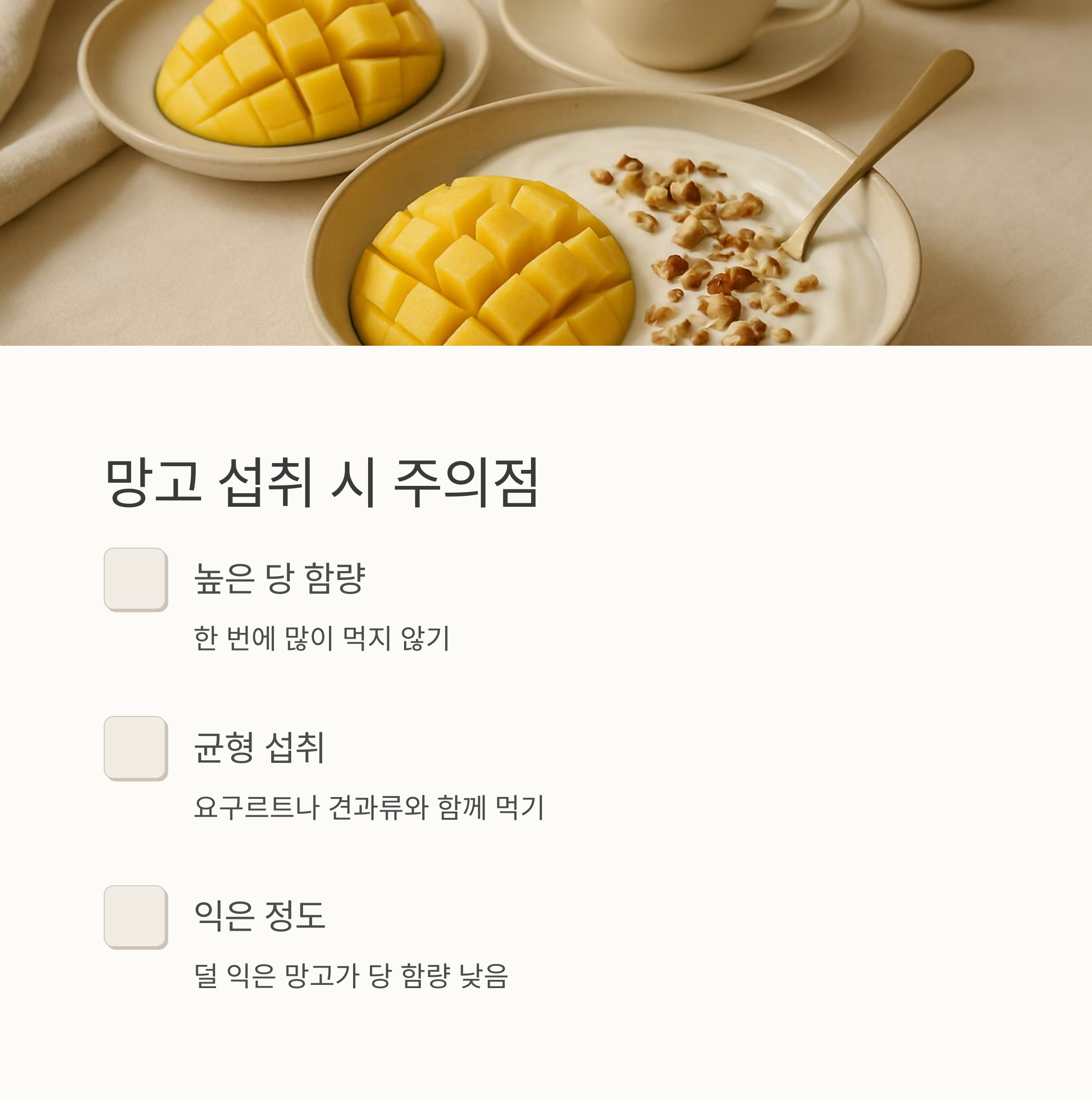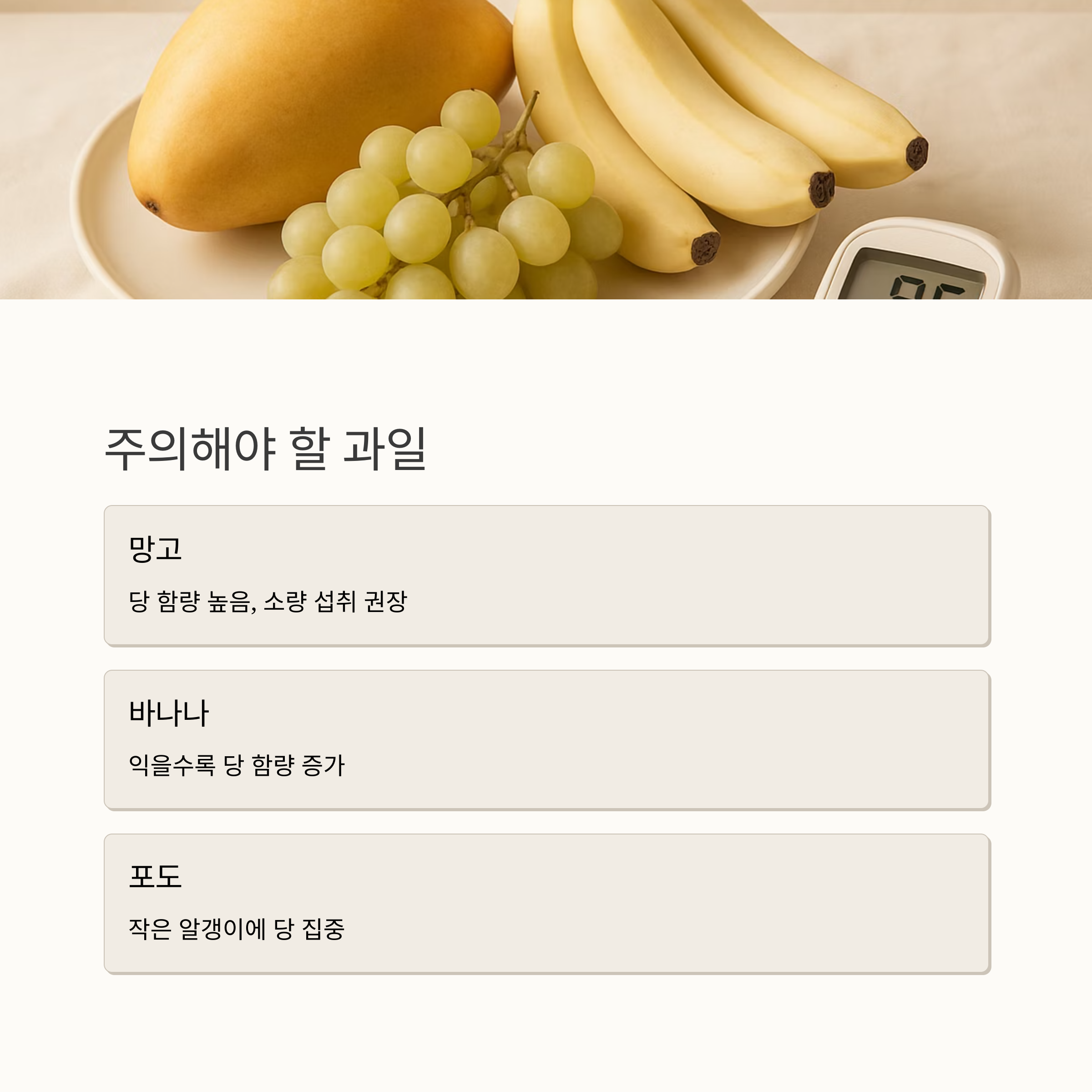 모든 과일이 당뇨병 관리에 좋은 것은 아니에요. 특히 혈당 지수(GI)가 높은 과일은 혈당을 급격하게 상승시킬 수 있기 때문에 주의해야 해요. 망고, 바나나, 포도처럼 당 함량이 높은 과일은 한 번에 많은 양을 섭취하면 혈당이 급격하게 올라갈 수 있어요. 이런 과일들은 소량으로 섭취하거나, 다른 음식과 함께 먹는 것이 좋답니다.