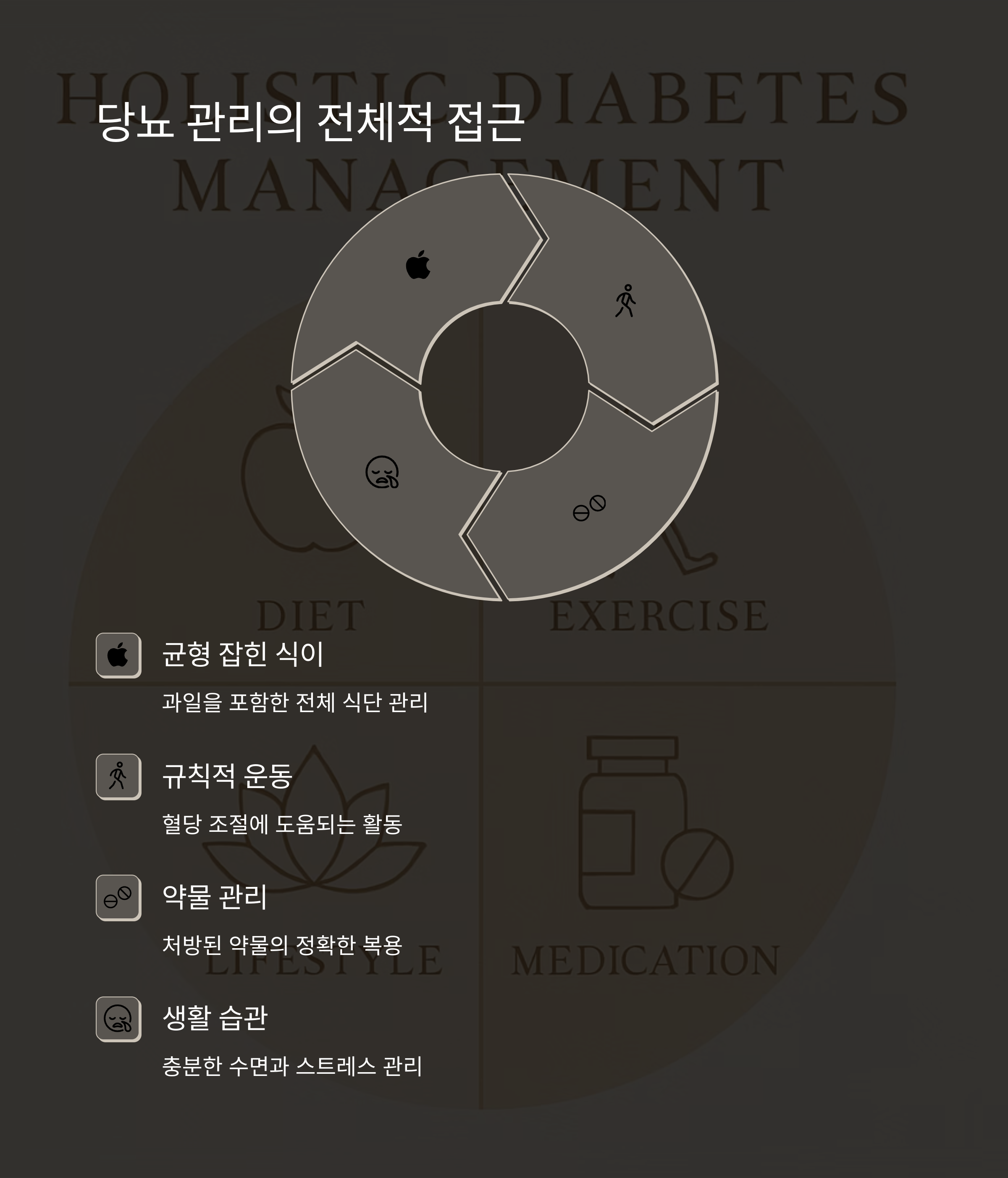 과일만 먹는 것보다 다른 음식과 함께 먹으면 혈당 조절에 더 효과적일 수 있어요. 예를 들어, 과일과 함께 견과류나 요구르트를 함께 섭취하면 섬유질과 단백질 섭취를 늘릴 수 있고, 혈당 상승 속도를 늦추는데 도움이 됩니다.