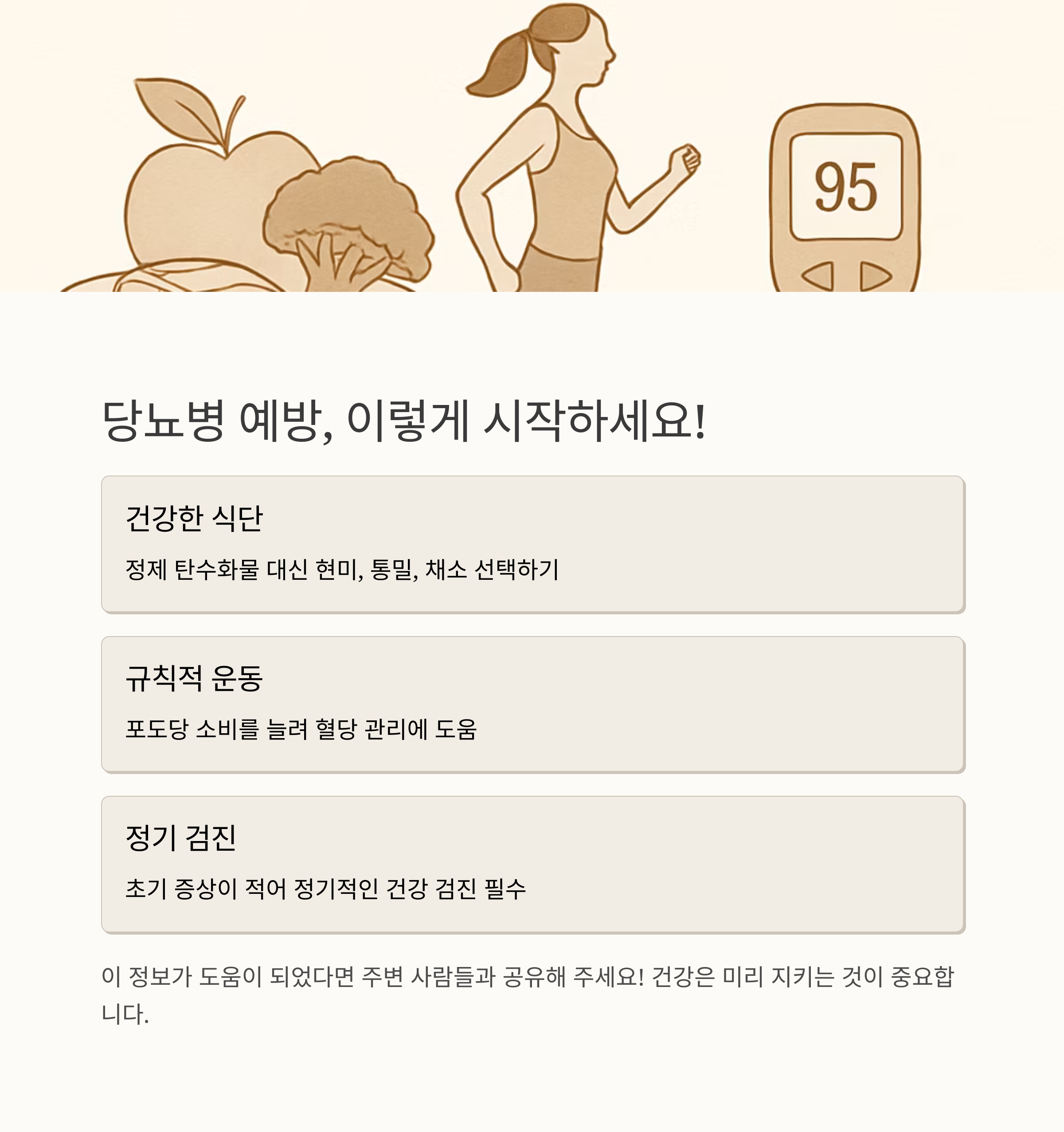당뇨 원인, 예방과 관리에 대한 이야기를 나누었는데요, 어떠셨나요? 당뇨병은 무서운 질환이지만 생활습관 개선을 통해 충분히 예방하고 관리할 수 있어요. 조금만 신경 쓰면 건강한 삶을 오래도록 누릴 수 있답니다. 오늘부터 바로 시작해 보세요! 건강한 식습관, 규칙적인 운동, 스트레스 관리, 충분한 수면… 이 작은 습관들이 모여 건강한 미래를 만들어갈 거예요! 그리고 잊지 마세요, 정기적인 건강 검진은 필수라는 사실을!