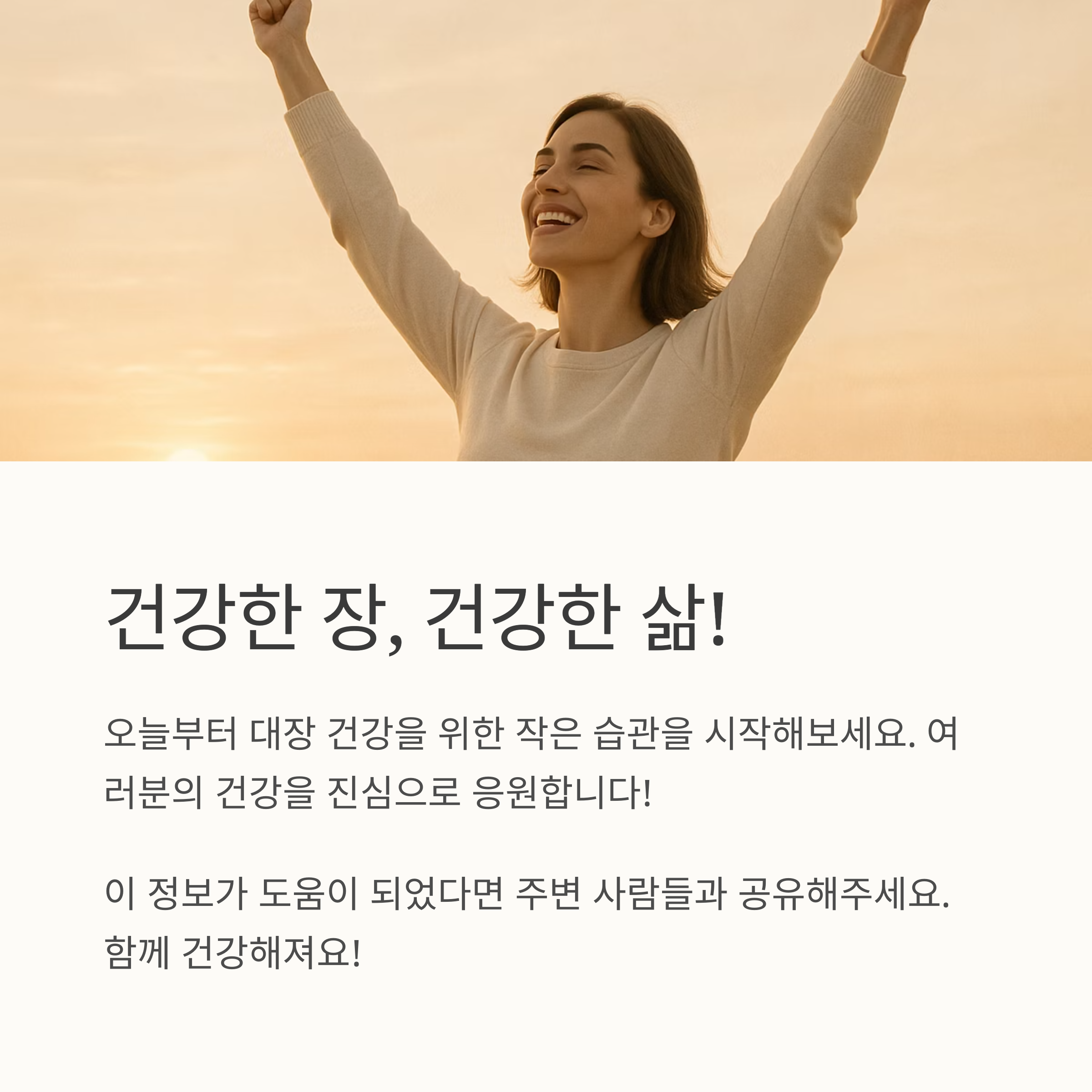 지금까지 대장 건강을 지키는 다양한 방법들에 대해 알아보았습니다. 대장에 좋은 음식 섭취부터 생활 습관까지, 우리의 노력 하나하나가 건강한 장을 만드는 밑거름이 될 거예요. 오늘부터 조금씩 실천해 보세요. 작은 변화들이 모여 건강하고 행복한 삶을 만들어 갈 수 있을 거예요. 건강한 삶은 꾸준한 노력으로 만들어집니다. 포기하지 마세요! 여러분의 건강을 응원합니다.