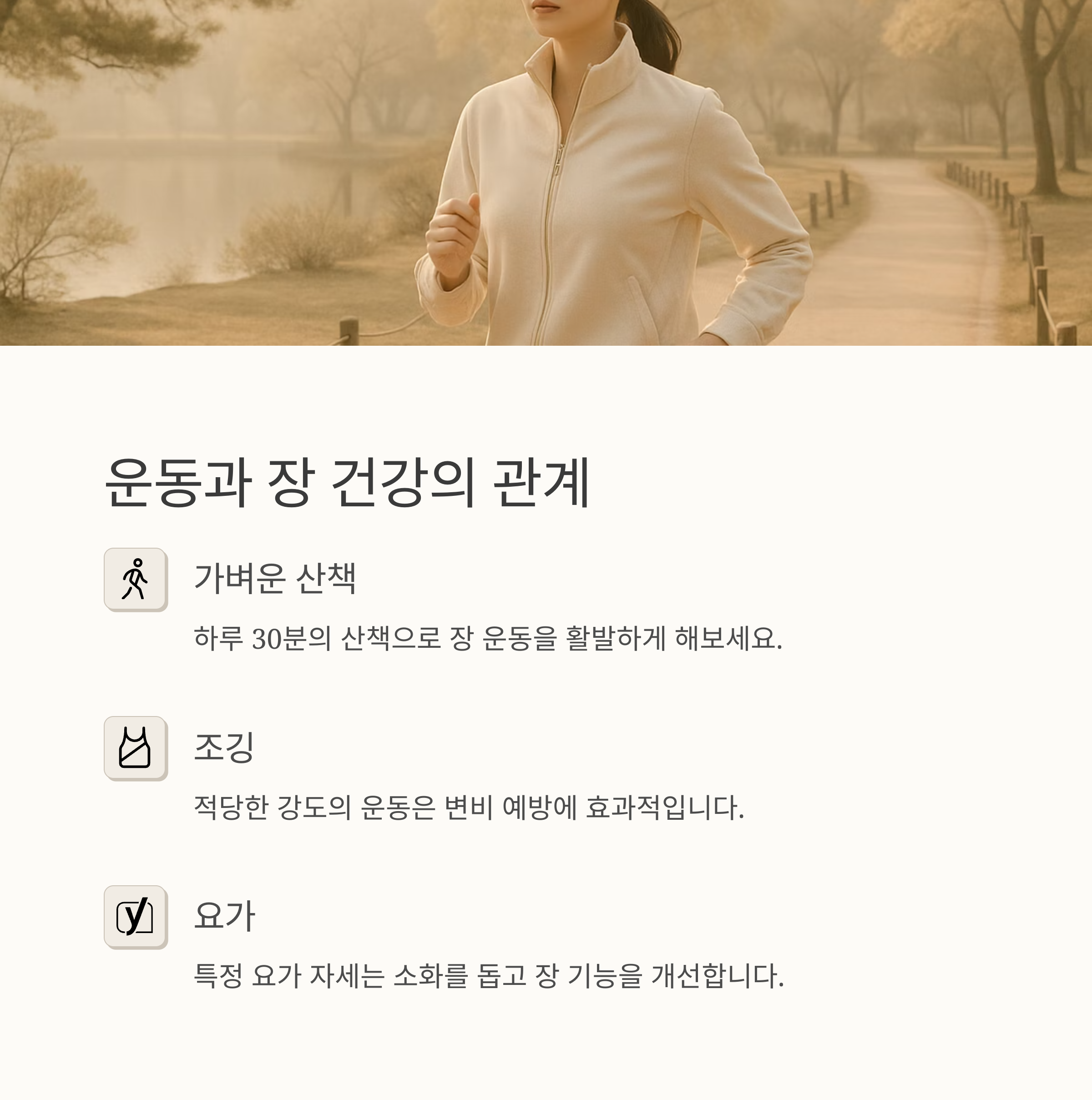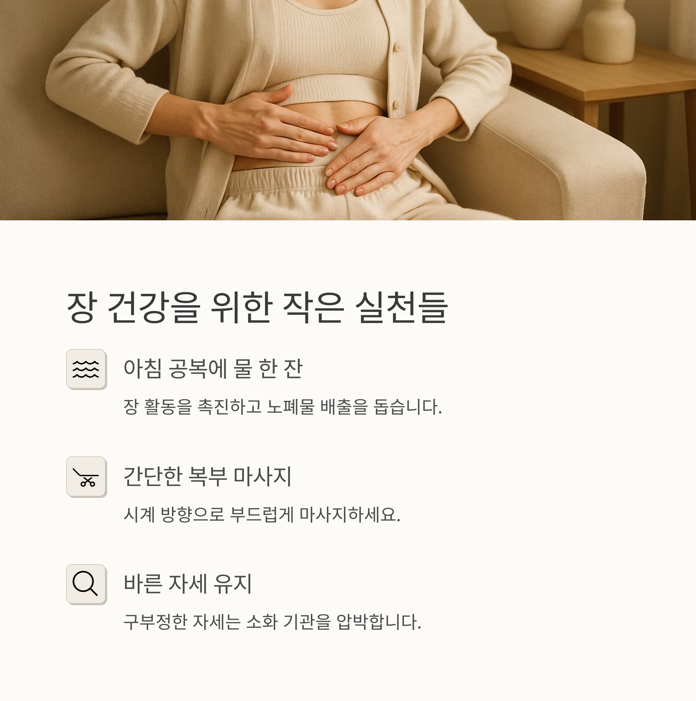 장 건강을 지키는 데는 식습관만큼이나 생활 습관도 중요해요. 매일 충분한 물을 마시는 것은 기본이고요, 규칙적인 운동도 빼놓을 수 없어요. 산책이나 가벼운 조깅 등으로 장 운동을 활발하게 해주면 변비 예방에도 도움이 된답니다.