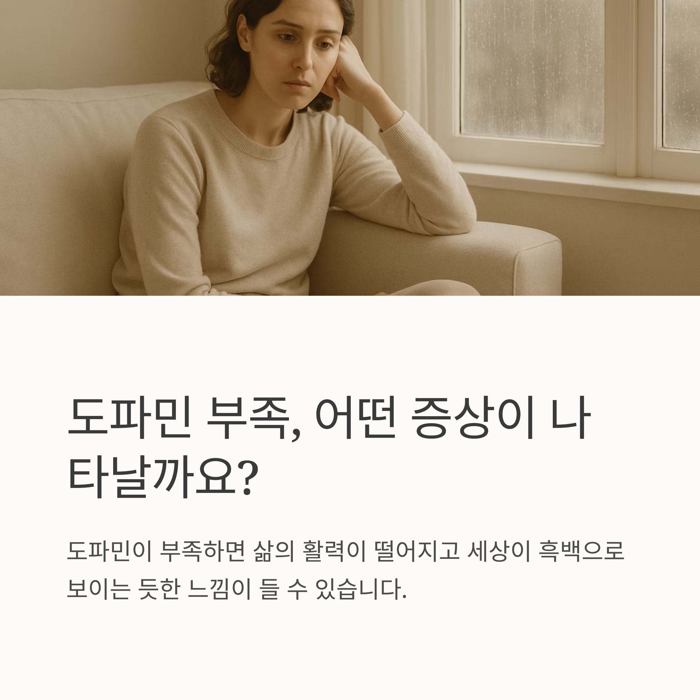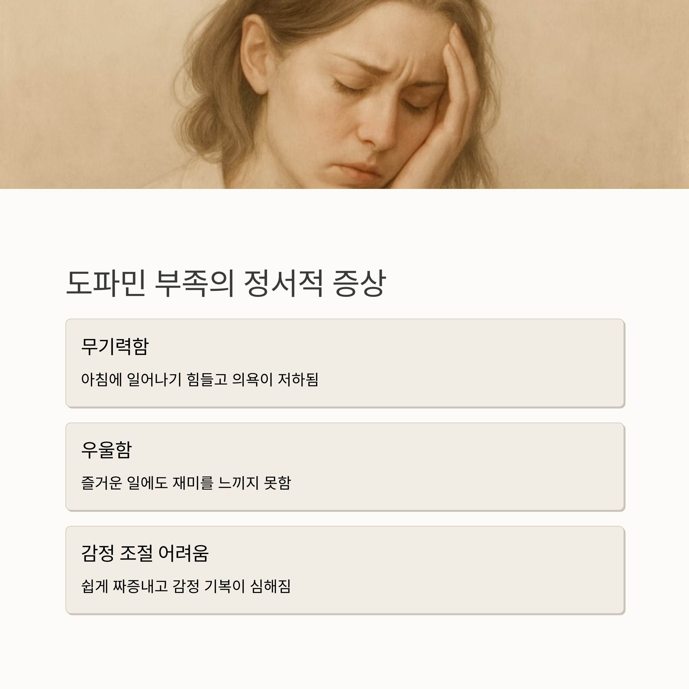 도파민이 부족하면 어떤 일이 일어날까요? 몸에 필요한 에너지가 부족한 것처럼, 우리의 삶의 활력도 떨어질 수 있습니다. 가장 흔한 증상은 무기력함과 우울함이에요. 아침에 눈을 뜨는 것조차 힘들고, 예전에는 즐거웠던 일들에도 재미를 느끼지 못하는 거죠.