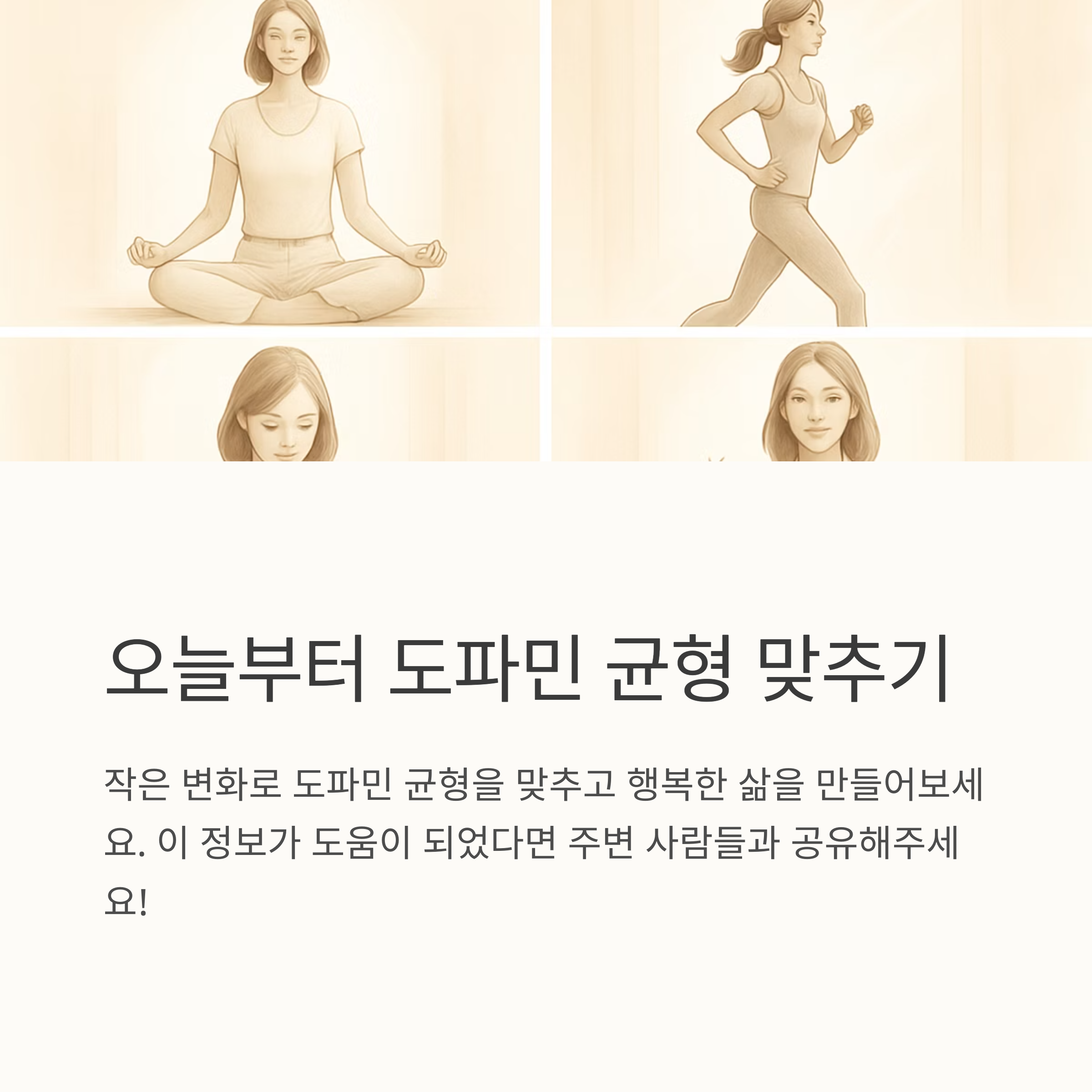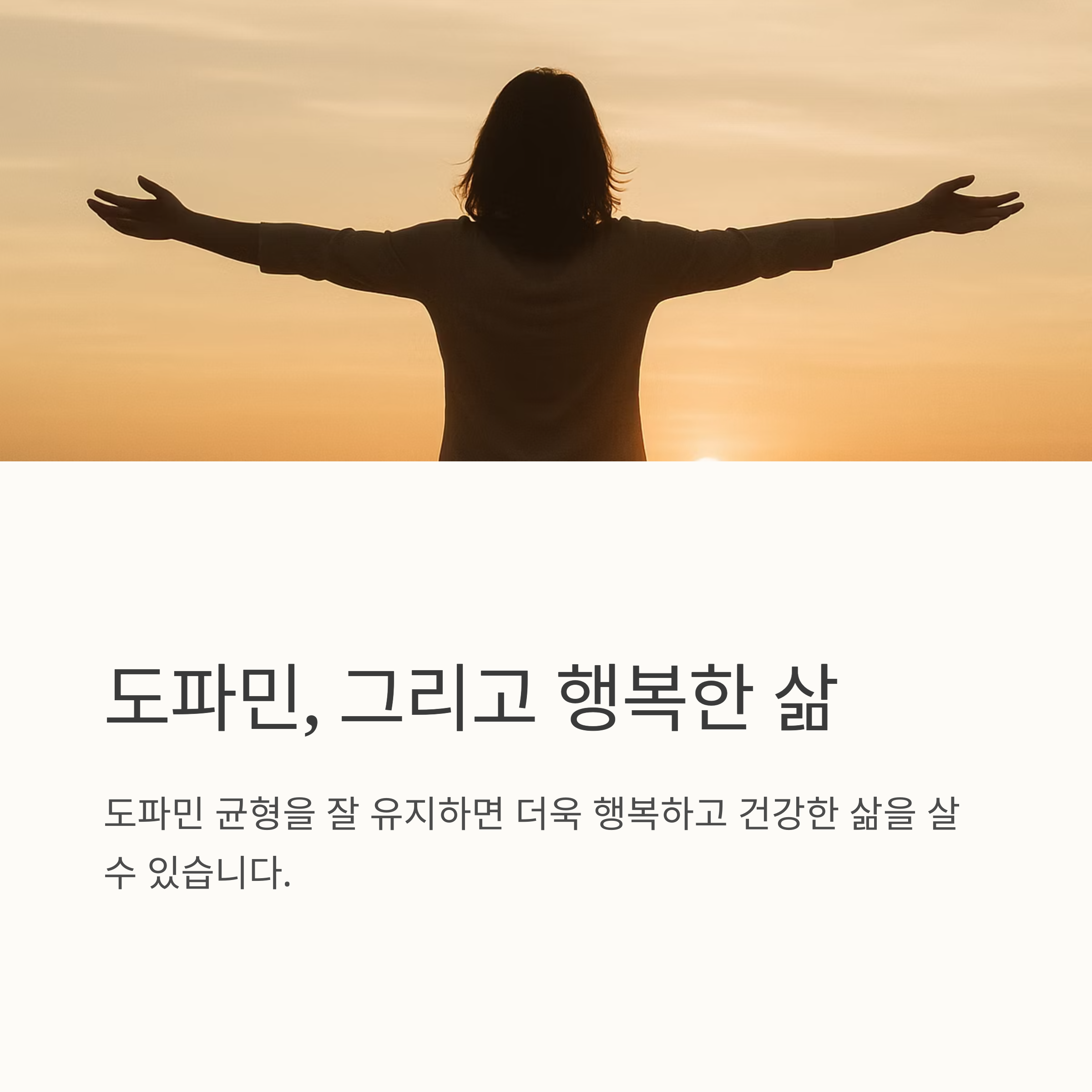 충분한 수면, 규칙적인 운동, 균형 잡힌 식사, 스트레스 관리, 그리고 사람들과의 긍정적인 관계 유지까지… 모두가 도파민 균형과 밀접한 관련이 있답니다. 도파민의 균형을 잘 유지하면, 우리는 더욱 행복하고 건강한 삶을 살 수 있을 거예요. 오늘부터 작은 변화를 통해 도파민 균형을 맞추고, 행복한 삶을 만들어가 보는 건 어떨까요? 도파민, 우리와 함께 건강한 삶을 만들어가는 중요한 친구임을 잊지 말아주세요.