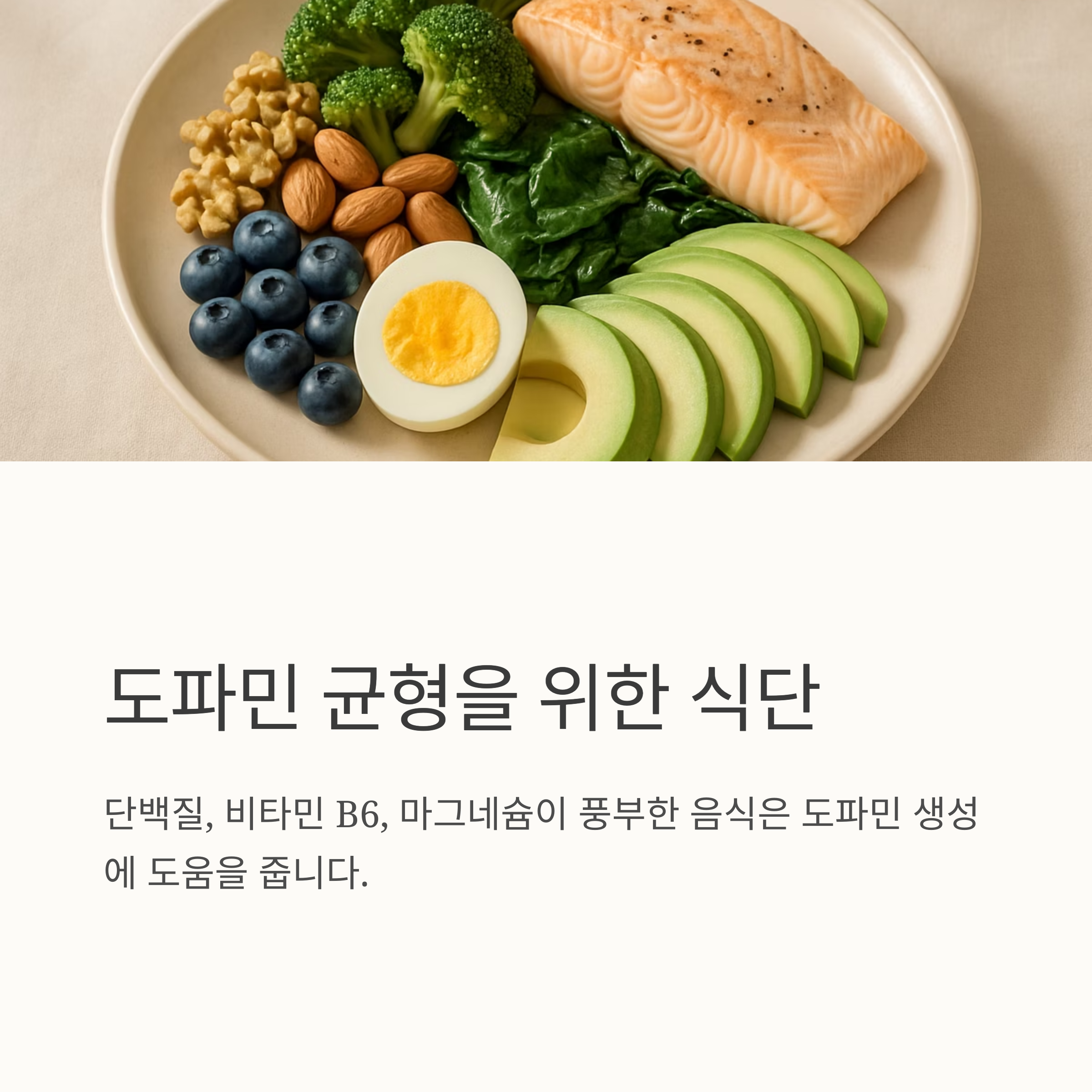 다행히도 우리는 도파민 균형을 맞추기 위해 노력할 수 있습니다. 먼저, 균형 잡힌 식단을 유지하는 것이 중요해요. 단백질, 비타민 B6, 마그네슘이 풍부한 음식을 섭취하면 도파민 생성에 도움이 된다고 합니다. 또, 규칙적인 운동은 도파민 수치를 높이고, 기분을 좋게 하는 데 도움을 줍니다.