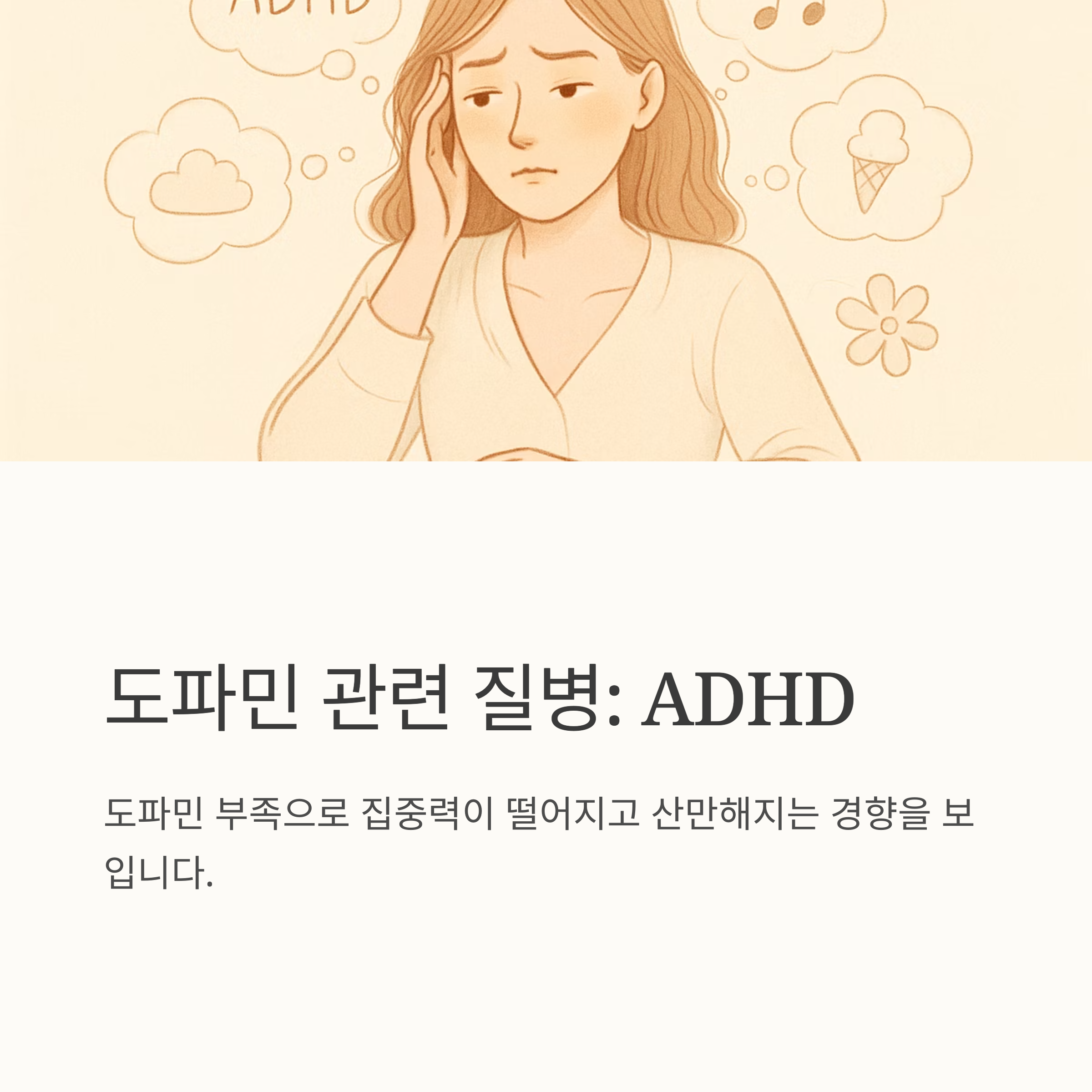 도파민과 관련된 질환들은 생각보다 다양합니다. 대표적인 예로 파킨슨병을 들 수 있는데요, 이 병은 도파민을 생산하는 뇌세포가 손상되면서 생기는 질환이죠. 손떨림, 몸이 굳는 증상, 움직임이 느려지는 등의 증상이 나타나 일상생활에 큰 불편을 겪게 됩니다.