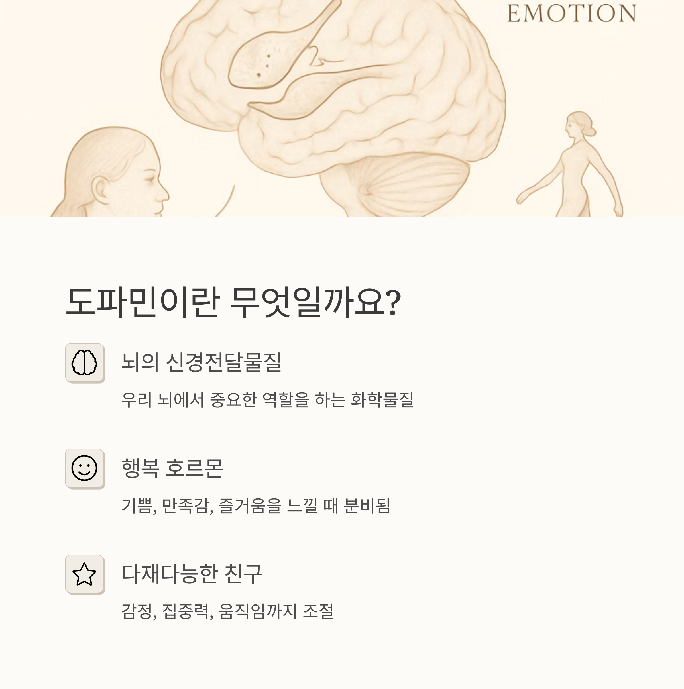 도파민이라는 친구, 혹시 들어보셨나요? 이 친구는 우리 뇌에서 중요한 역할을 하는 신경전달물질인데요. "행복 호르몬"이라고도 불리는 이유는, 기쁨, 만족감, 즐거움 같은 긍정적인 감정을 느낄 때 팡팡 터져 나오기 때문이에요.