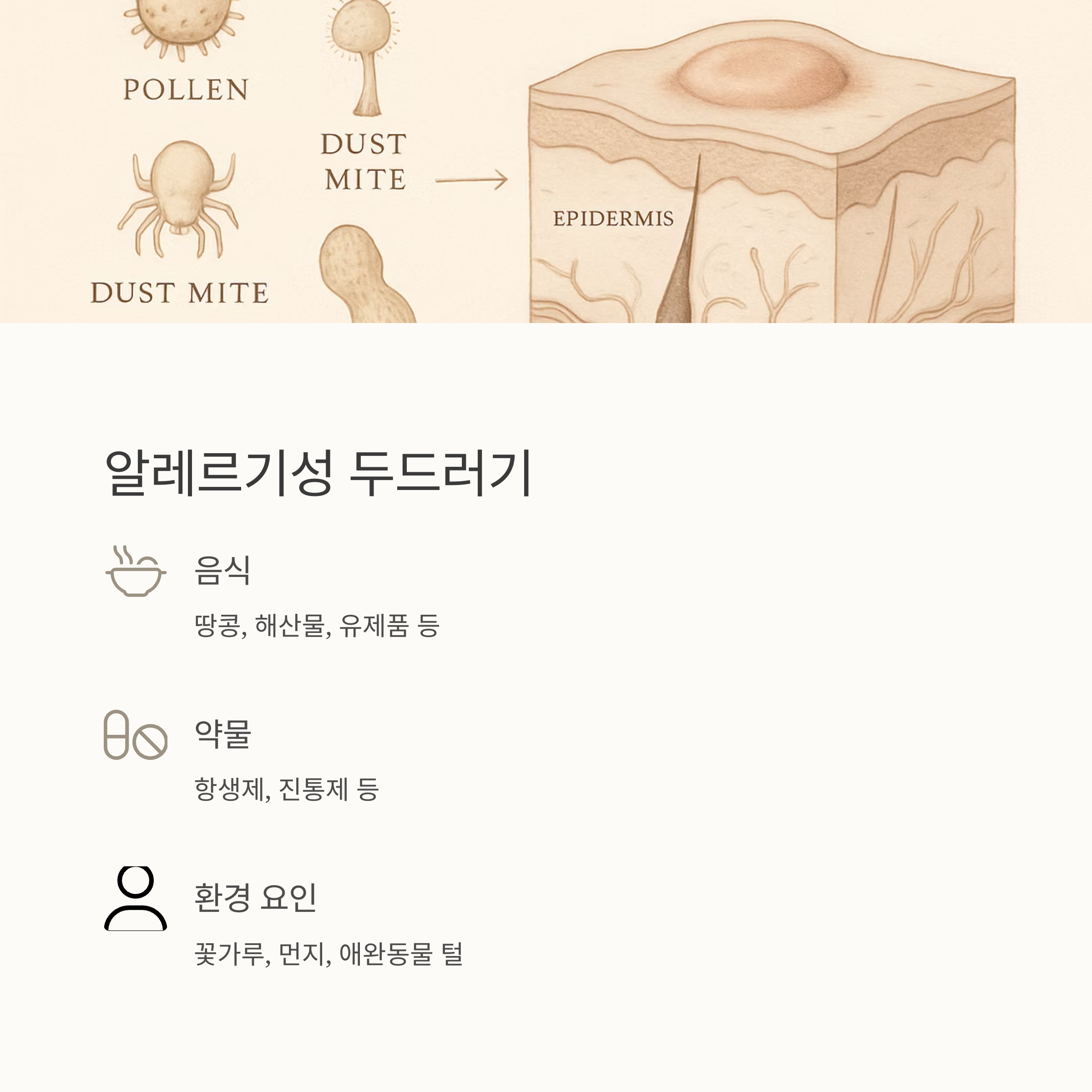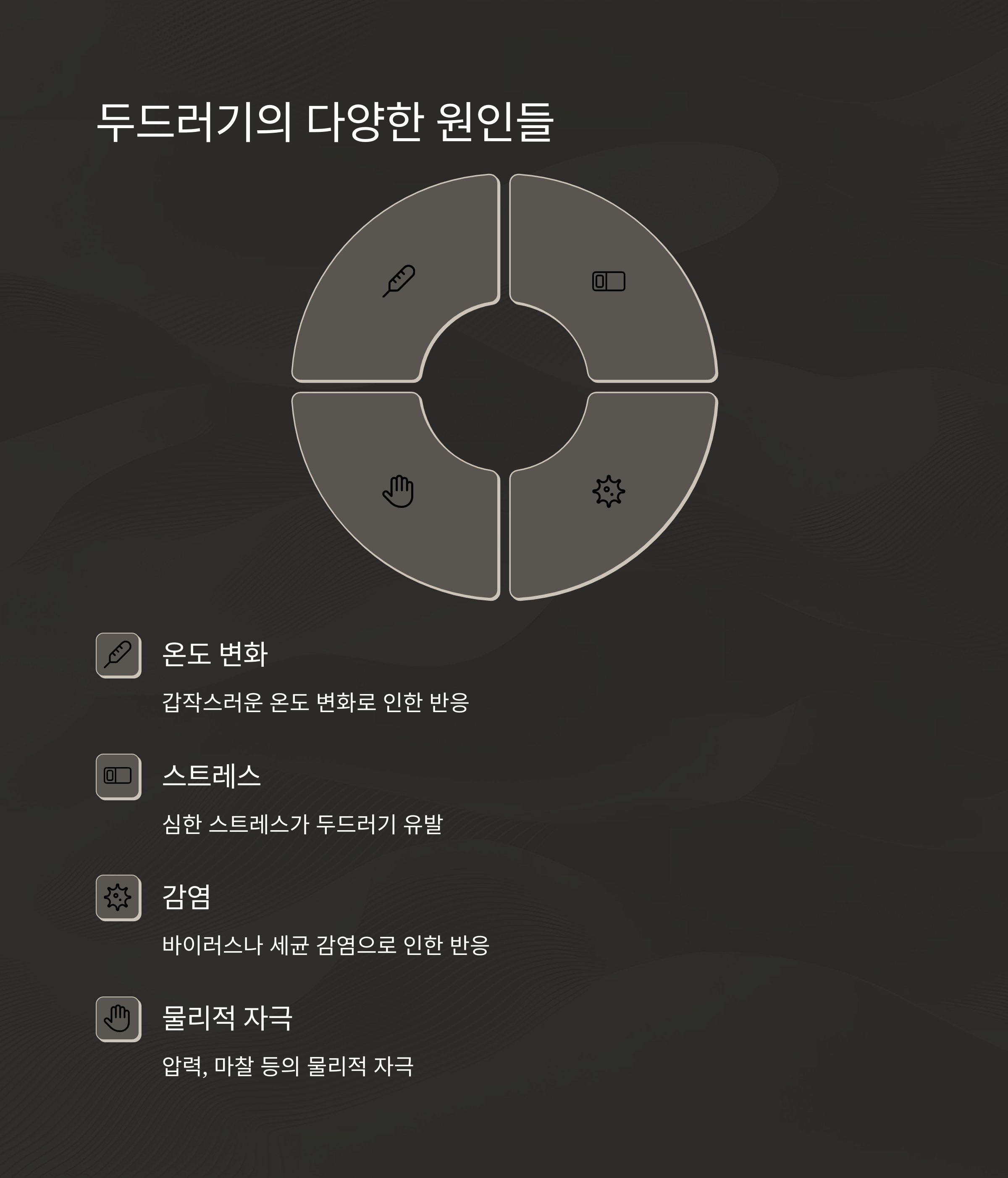 두드러기의 원인은 정말 천차만별이에요. 가장 흔한 건 알레르기 반응이죠. 음식, 약, 꽃가루, 먼지, 애완동물의 털 등등 생각보다 정말 많은 것들이 알레르기 원인이 될 수 있어요. 저는 예전에 땅콩 알레르기가 있는 줄도 모르고 땅콩 들어간 과자를 먹었다가 온몸에 두드러기가 난 적이 있어요.