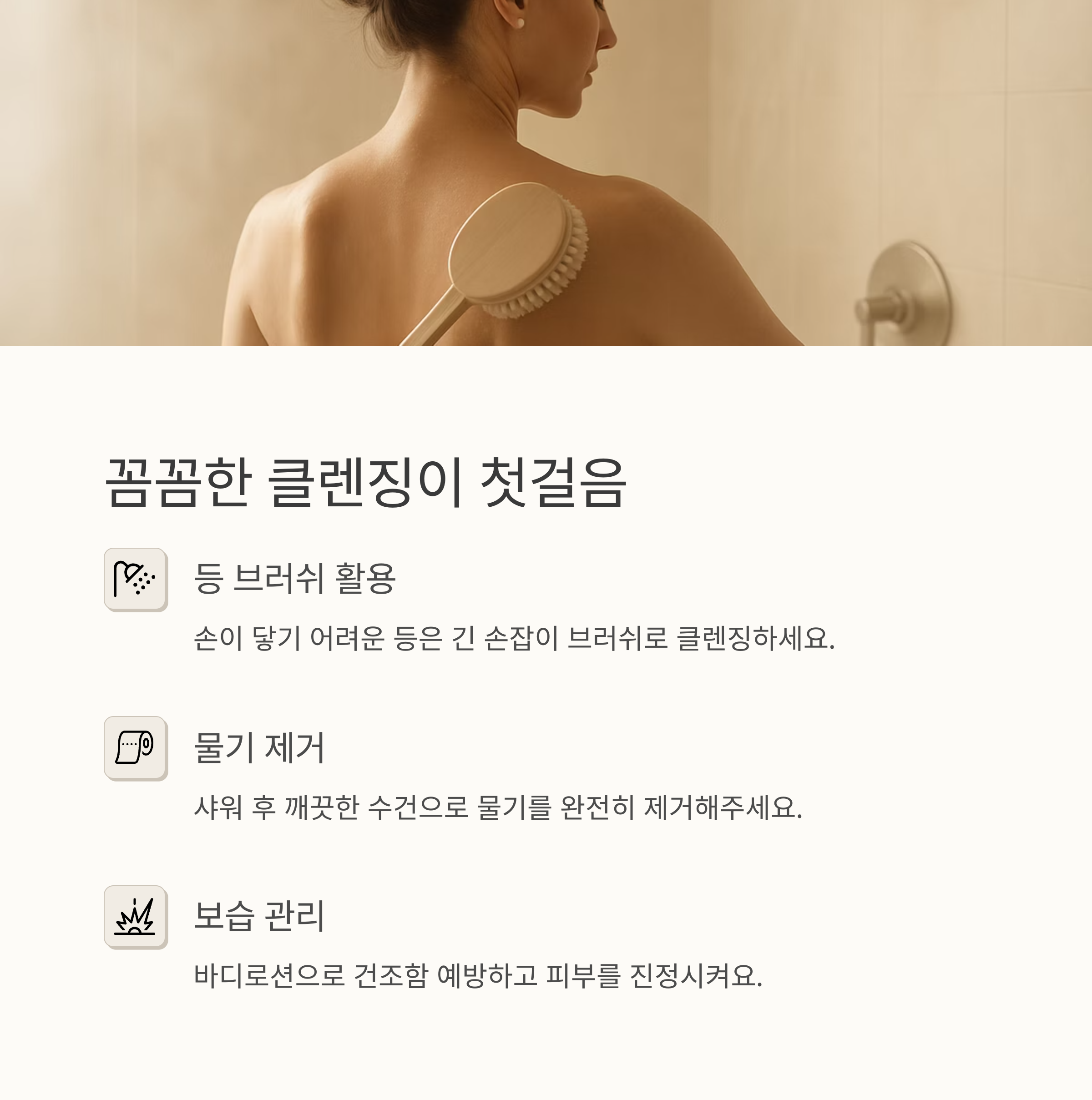 그리고 샤워 후에는 깨끗한 수건으로 물기를 꼼꼼하게 제거해주는 것도 중요해요. 남아있는 물기는 피부를 짓무르게 할 수 있고 세균 번식을 촉진시킬 수 있답니다. 저는 샤워 후 꼭 등까지 말리는데 신경쓰는 편이에요! 습기는 정말 최악의 적이니까요! 그리고 샤워 후 바디로션을 듬뿍 바르면 건조함을 예방하고 피부 진정에도 효과적이랍니다.