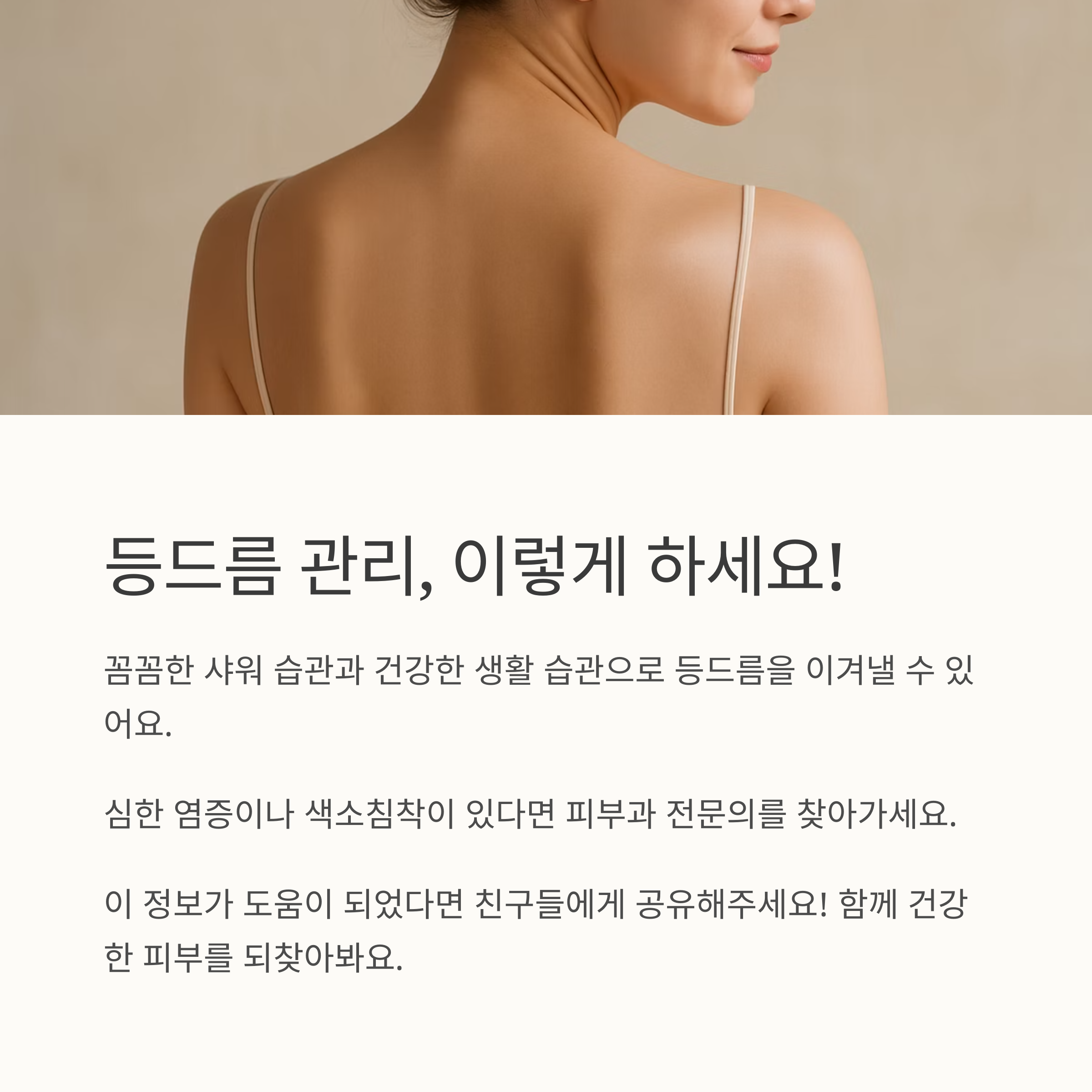 등드름 때문에 고민이 많으시죠? 하지만 이 글을 통해 등드름의 원인과 관리법을 제대로 알게 되셨다면 이제 희망이 보입니다! 오늘부터 꼼꼼한 샤워 습관과 건강한 생활 습관을 실천하고, 필요하다면 피부과 전문의의 도움을 받으세요. 조금만 노력하면 깨끗하고 건강한 등 피부를 되찾을 수 있습니다! 포기하지 마세요!