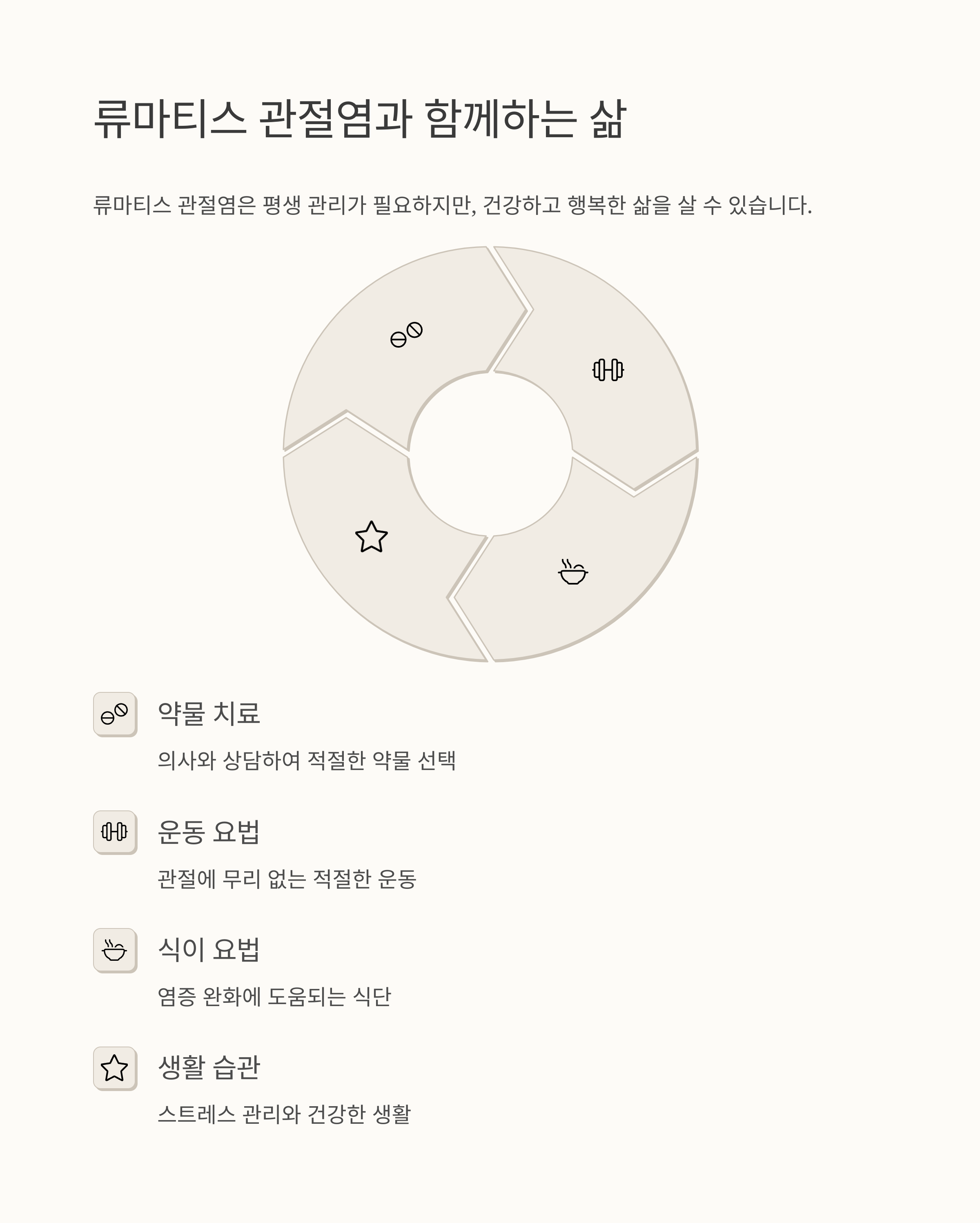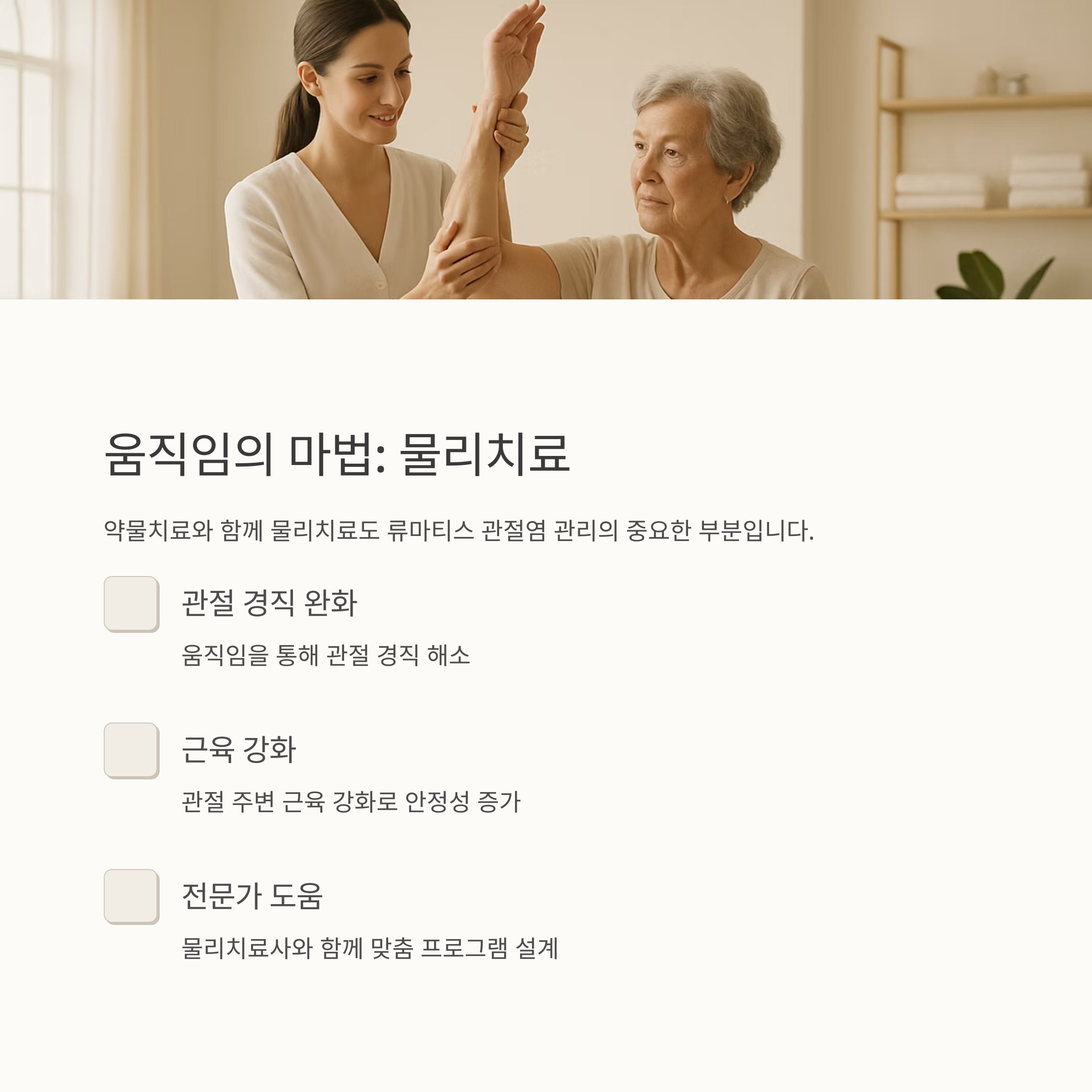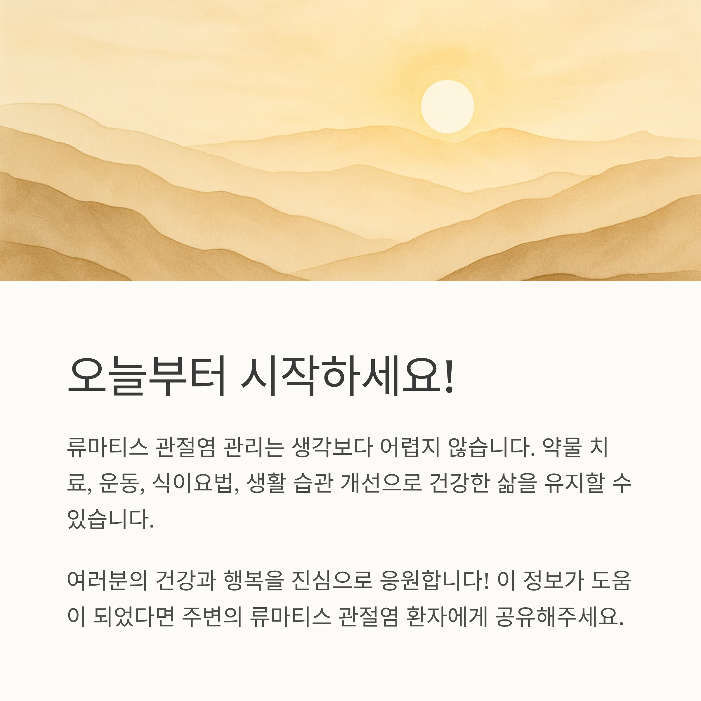 류마티스 관절염 관리, 생각보다 어렵지 않아요. 오늘부터 조금씩 실천해 보세요! 약물 치료, 운동, 식이요법, 생활 습관 개선 등 다양한 방법을 통해 류마티스 관절염 증상을 완화하고 건강한 삶을 유지할 수 있다는 것을 잊지 마세요. 이 모든 과정이 힘들더라도, 여러분은 혼자가 아니라는 것을 기억하세요! 언제든지 의사 선생님, 물리치료사 선생님, 그리고 가족, 친구들과 마음을 나누고 도움을 받으세요. 여러분의 건강과 행복을 진심으로 응원합니다!