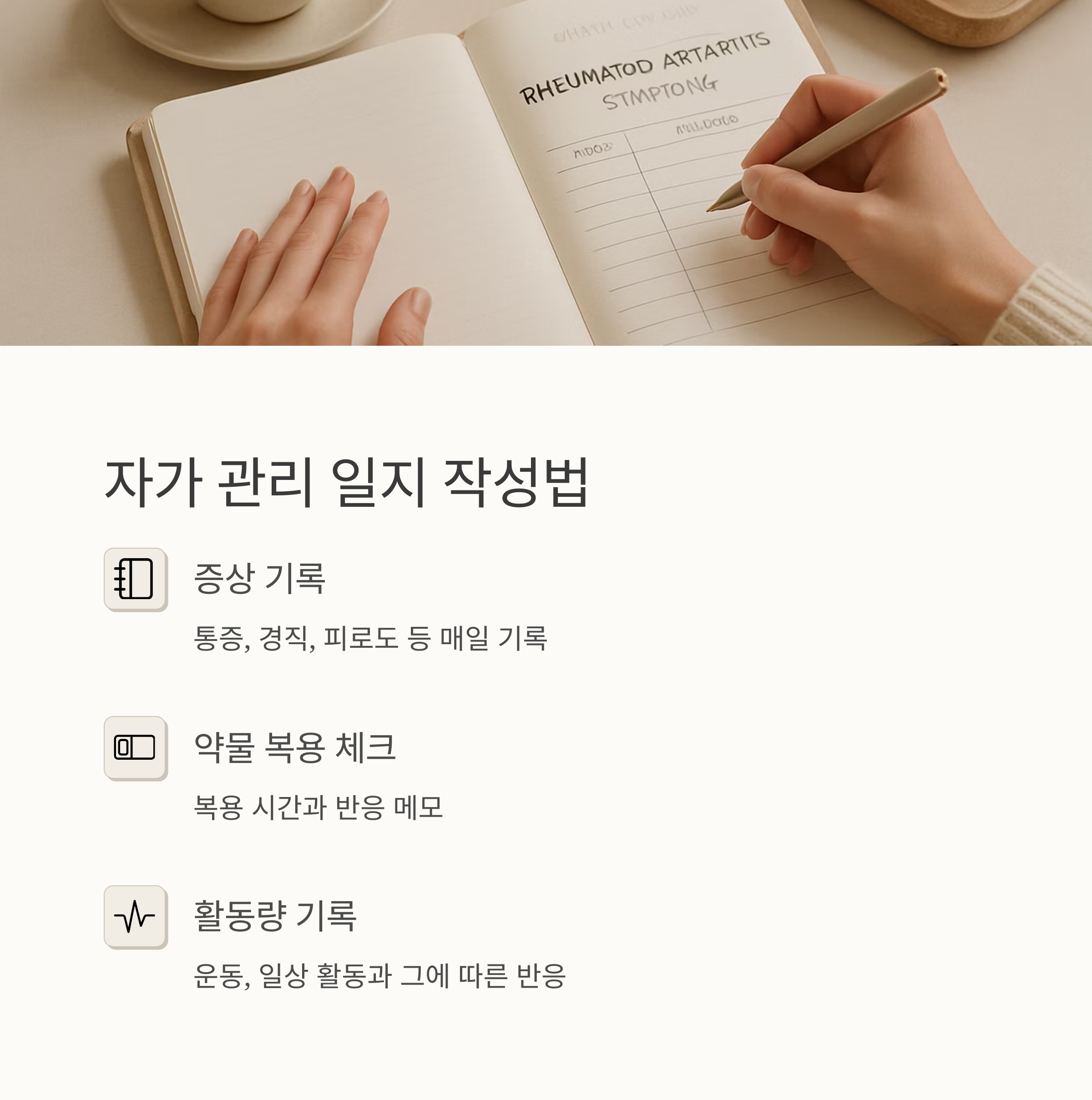 그리고 관절 통증에 온찜질과 냉찜질을 병행하는 것도 도움이 될 수 있어요. 아침에는 따뜻하게, 붓거나 열감이 있을 때는 차갑게 찜질해주면 좋습니다. 그리고 무엇보다도 중요한 것은 정기적인 병원 진료와 꾸준한 자가 관리예요. 내 몸의 변화를 꼼꼼히 기록하고 의사 선생님과 꾸준히 소통하면서 관리해 나가면, 류마티스 관절염과 함께 건강하고 행복한 삶을 살아갈 수 있답니다!