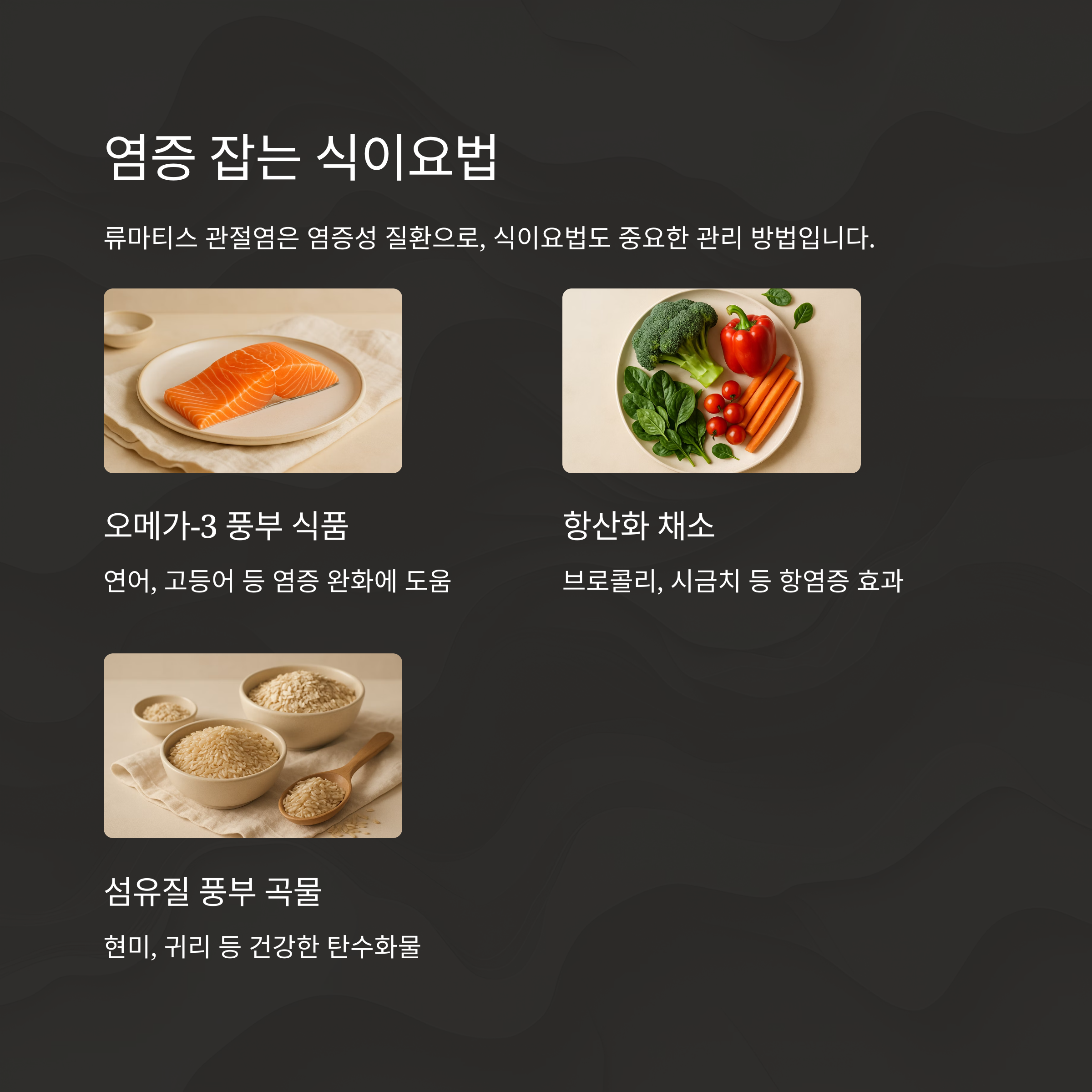 류마티스 관절염은 염증성 질환이기 때문에, 먹는 음식도 신경 써야 해요. 염증을 악화시키는 음식은 줄이고, 염증을 완화하는 음식은 늘리는 것이 중요한데요, 연어, 고등어처럼 오메가-3 지방산이 풍부한 생선이나, 브로콜리, 시금치 같은 항산화 채소, 그리고 섬유질이 풍부한 현미, 귀리 등을 챙겨 드시면 도움이 될 거예요.