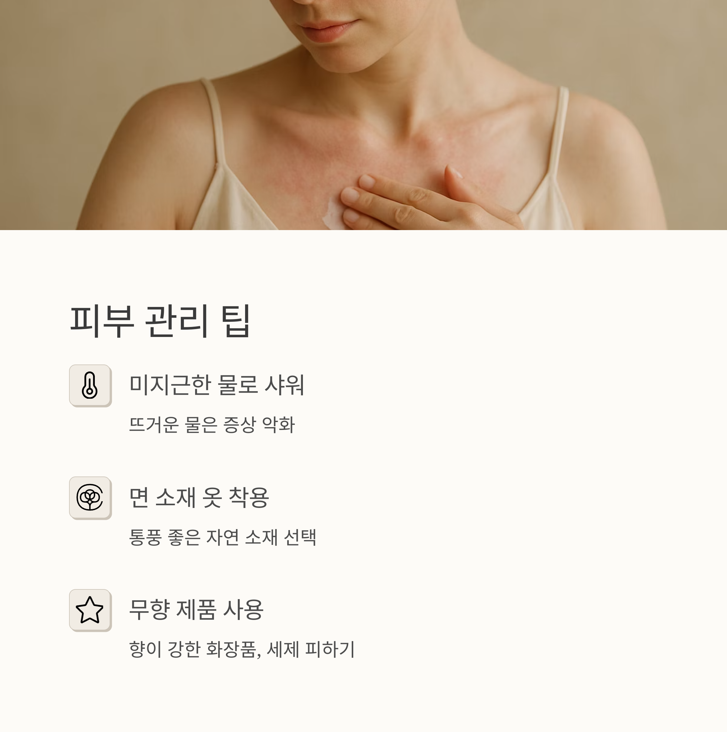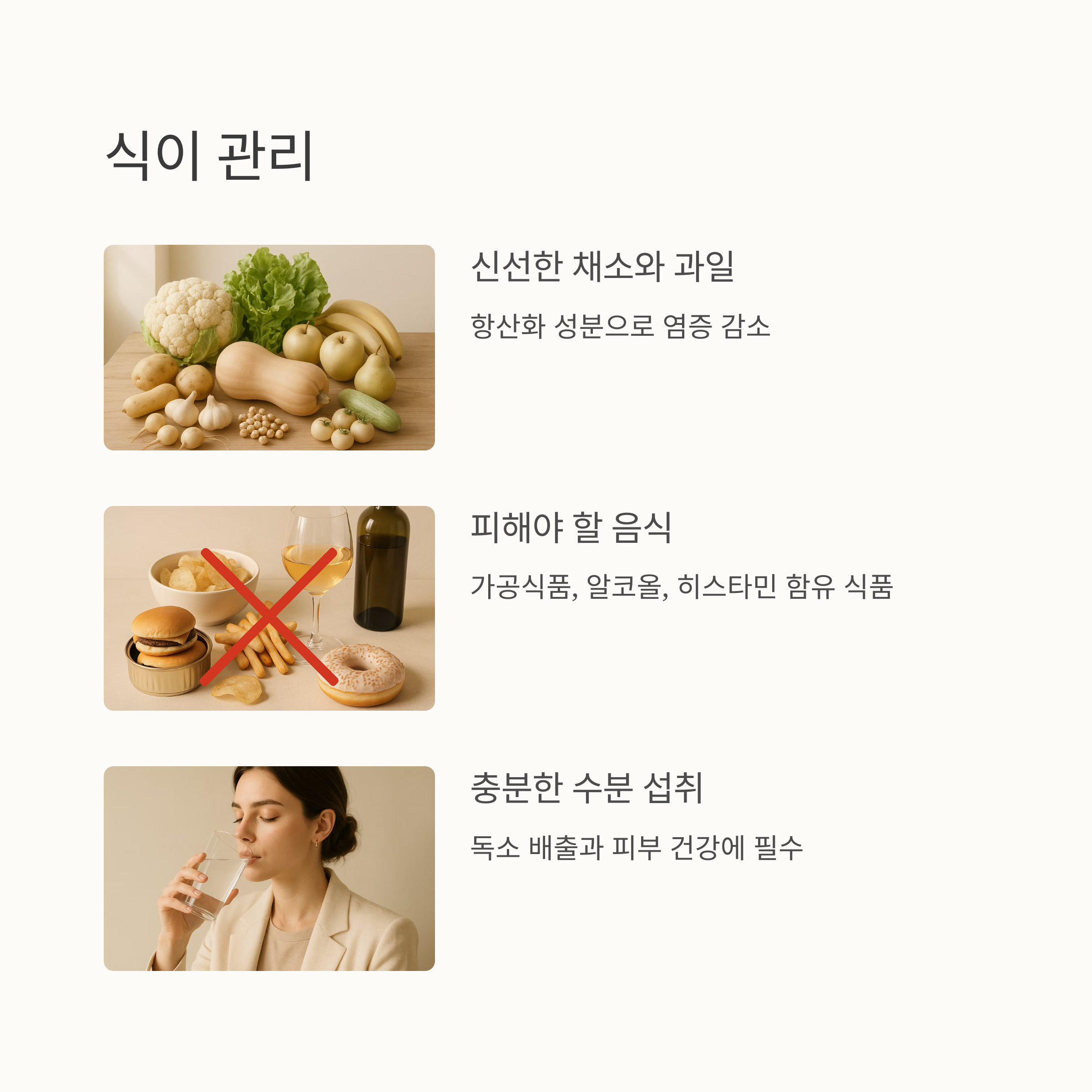 가공식품이나 인스턴트 음식 대신 신선한 채소와 과일을 많이 먹고, 알레르기 유발 식품이나 히스타민이 많은 음식은 피하는 게 좋아요. 술과 담배는 절대 금물이고요. 피부 자극도 최소화해야 해요. 향이 강한 화장품이나 세제는 피하고, 꽉 끼는 옷 대신 통풍이 잘 되는 옷을 입으세요.