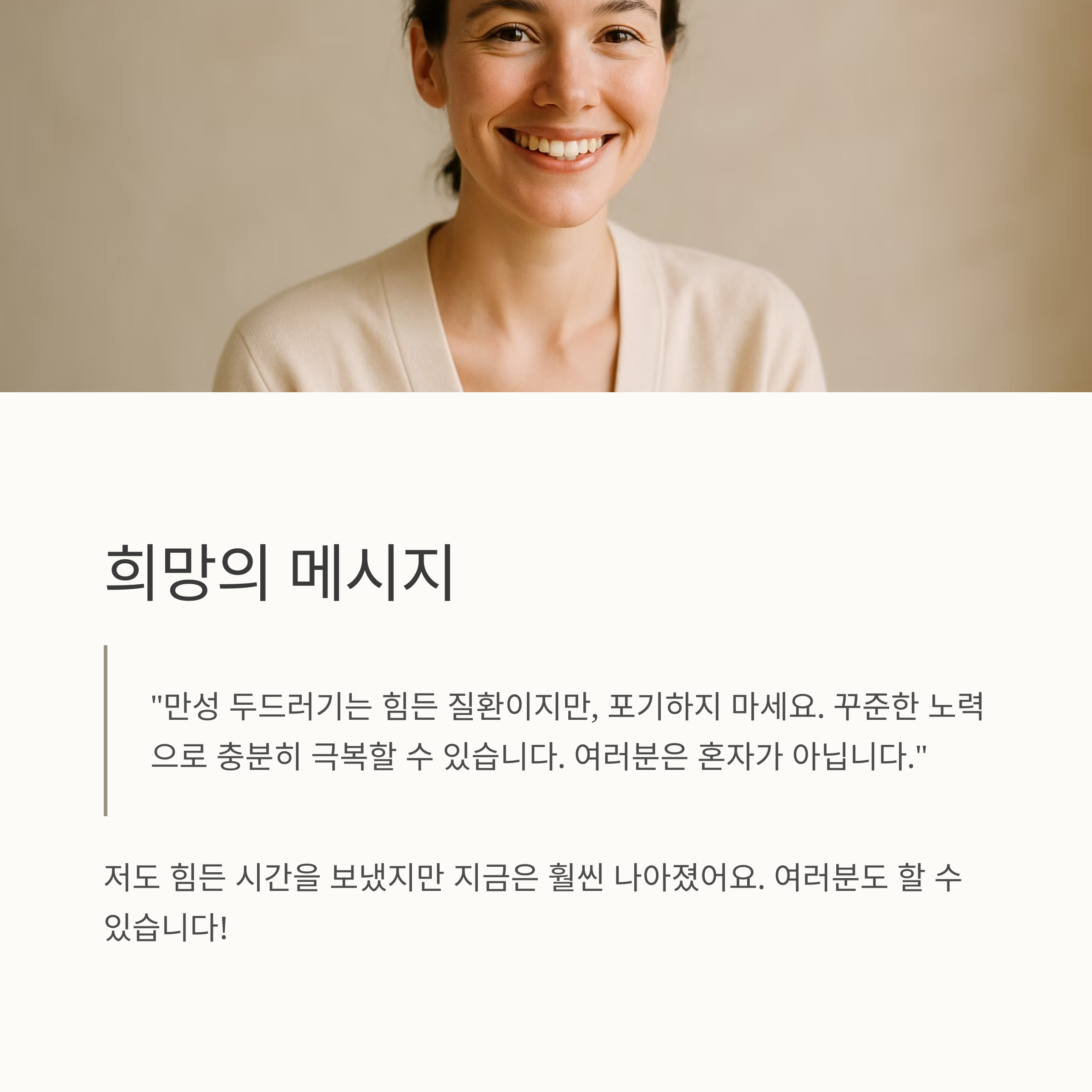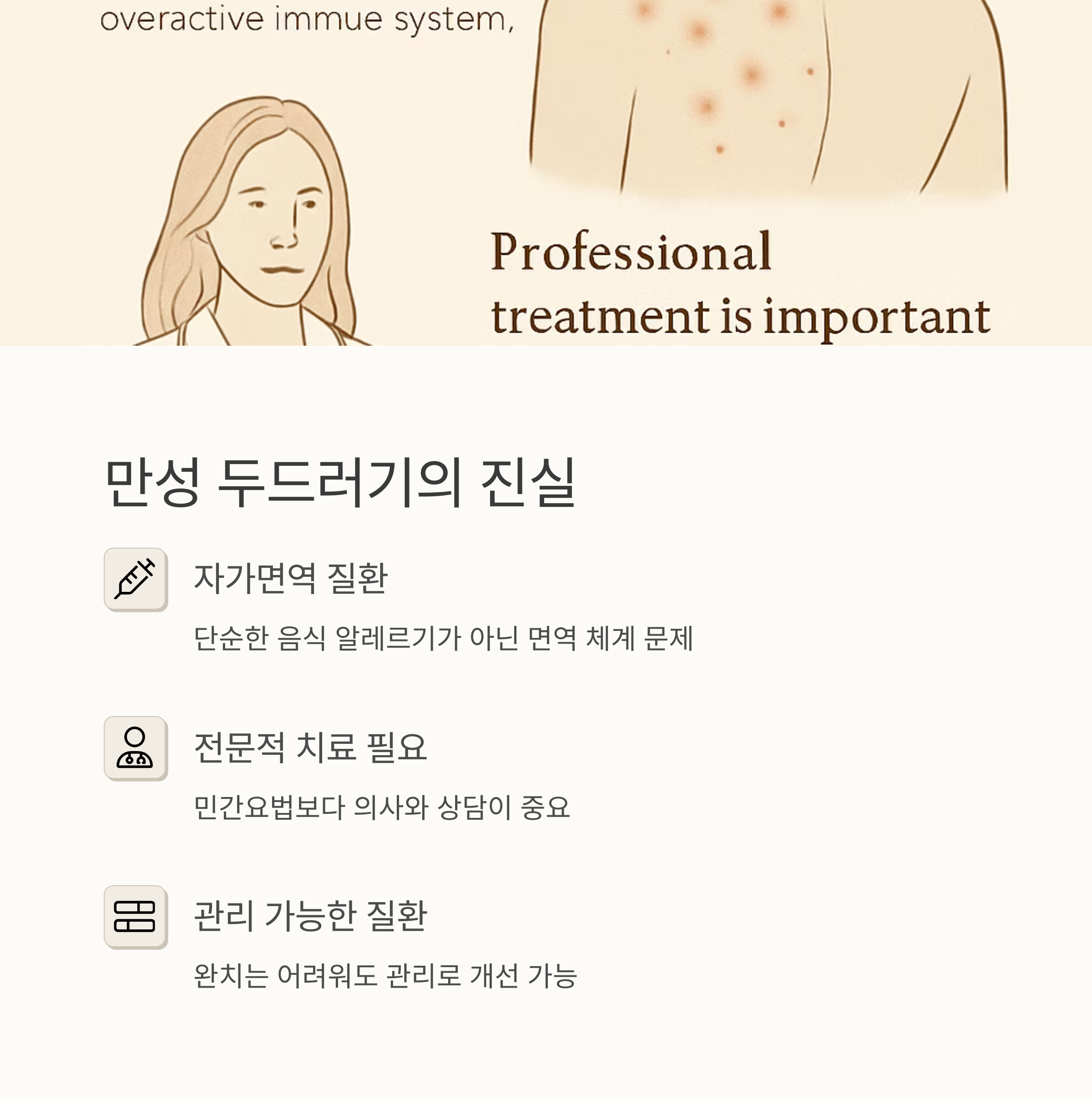 그리고 무엇보다 중요한 것은, 만성 두드러기는 완치가 어려워도 관리하면서 충분히 괜찮아질 수 있다는 사실이에요. 절대 포기하지 마세요! 저처럼 잘못된 정보에 휘둘리지 말고, 의사 선생님과 상담하면서 치료받는 것이 가장 중요하다는 걸 꼭 기억하세요.