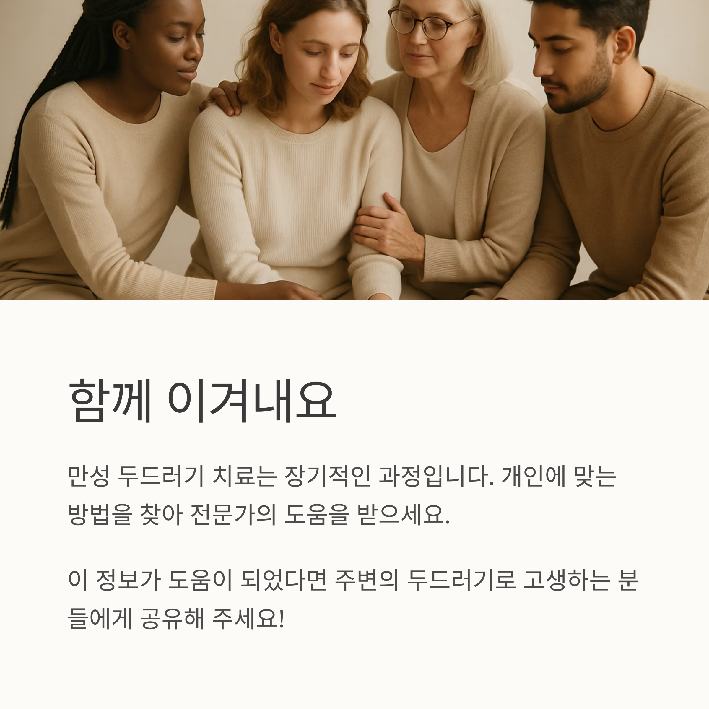 만성 두드러기는 정말 힘든 질환이지만, 포기하지 마세요. 꾸준한 치료와 생활 습관 관리를 통해 충분히 극복할 수 있습니다. 의사 선생님과 긴밀하게 소통하고, 자신에게 맞는 치료 계획을 세우는 것이 중요해요. 가족이나 친구들의 도움도 받으면서 긍정적인 마음으로 꾸준히 노력한다면, 반드시 극복할 수 있을 거예요. 저도 그랬거든요.