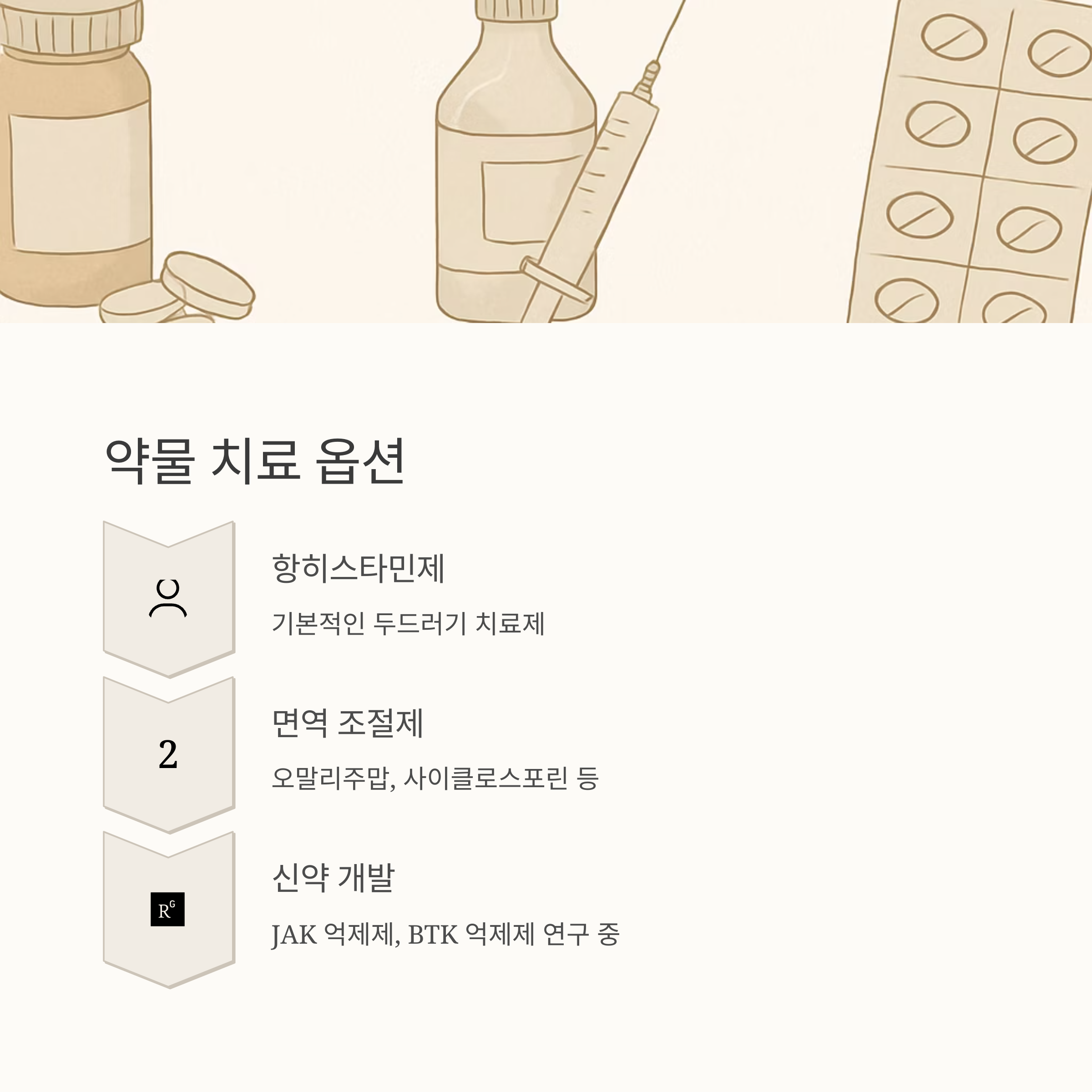 오말리주맙이나 사이클로스포린 같은 약물들이 있는데, 이 약들은 면역 반응을 조절해서 두드러기를 완화시켜 줍니다. 하지만 이런 약들은 부작용이 있을 수 있으니, 반드시 의사와 충분히 상담하고 결정해야 해요. 그리고 햇빛을 이용한 광선 치료도 있어요. 특정 파장의 자외선을 이용해서 염증을 줄이는 방법인데, 피부과 전문의의 지시에 따라 진행해야 부작용을 최소화할 수 있습니다.
