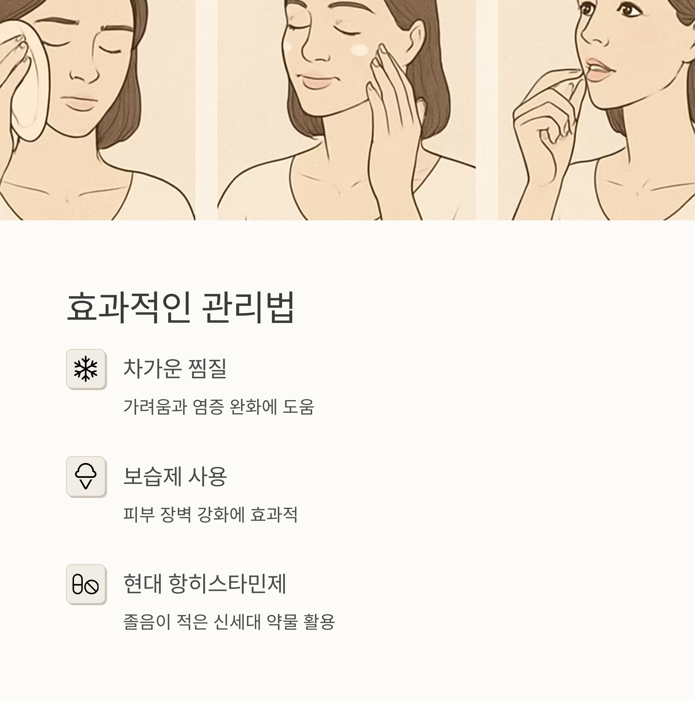 오히려 피부 손상을 일으켜 염증을 더 심하게 만들 수 있으니, 차가운 찜질이나 보습제를 사용하는 것이 훨씬 낫답니다. 항히스타민제도 마찬가지예요. 옛날 약들은 졸음이 많았지만, 요즘은 졸음이 적은 약들이 많으니 걱정 마세요.