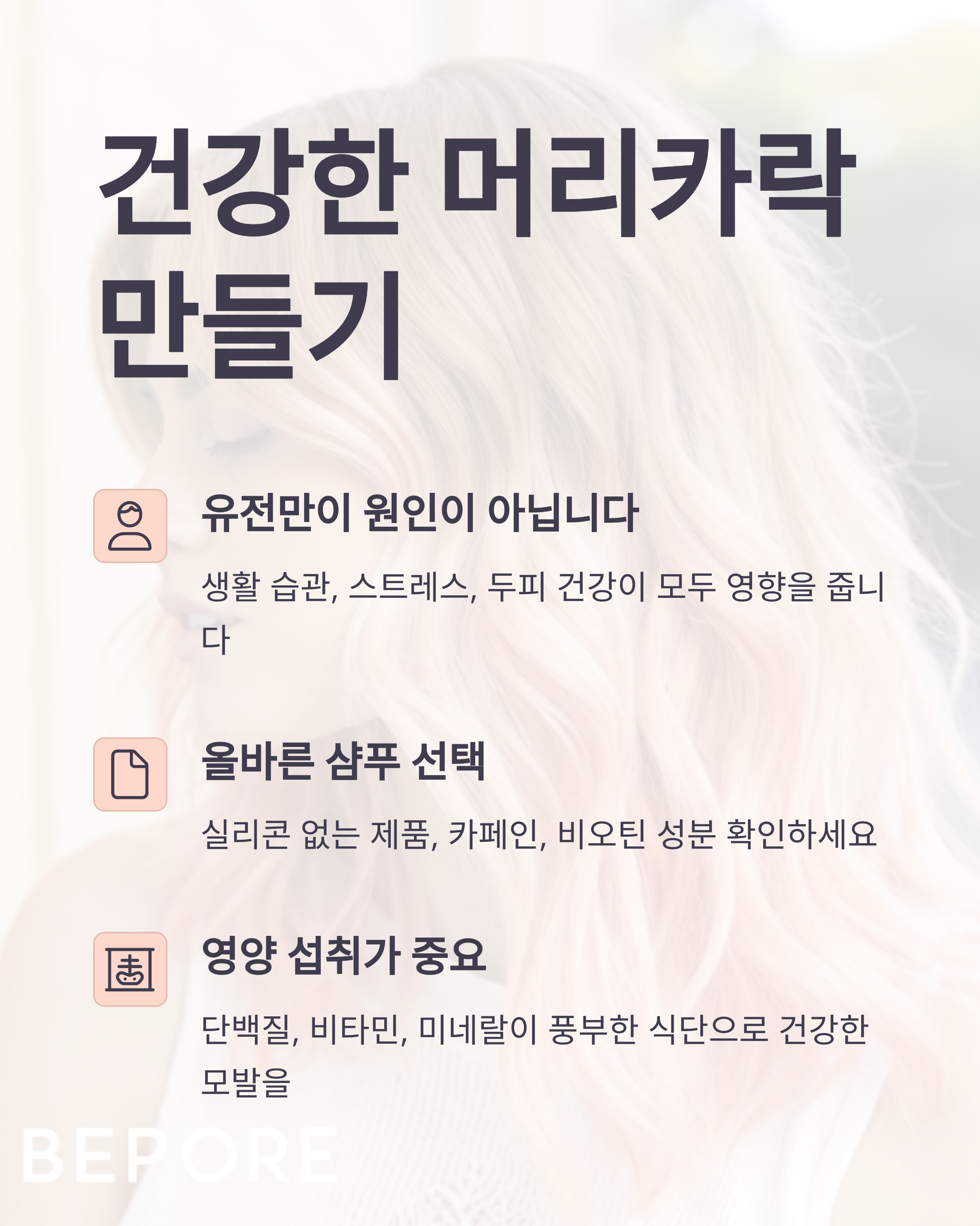 푸석하고 힘없는 머리카락 때문에 고민이신가요? 유전 탓만 하기엔 억울하죠. 건강한 두피와 식습관으로 가늘어진 머리카락도 충분히 굵고 튼튼하게 만들 수 있습니다. 지금부터 저와 함께 머리카락 굵어지는 방법, 꼼꼼하게 알아보고 실천해서 자신감 넘치는 풍성한 머리숱을 되찾아봐요!