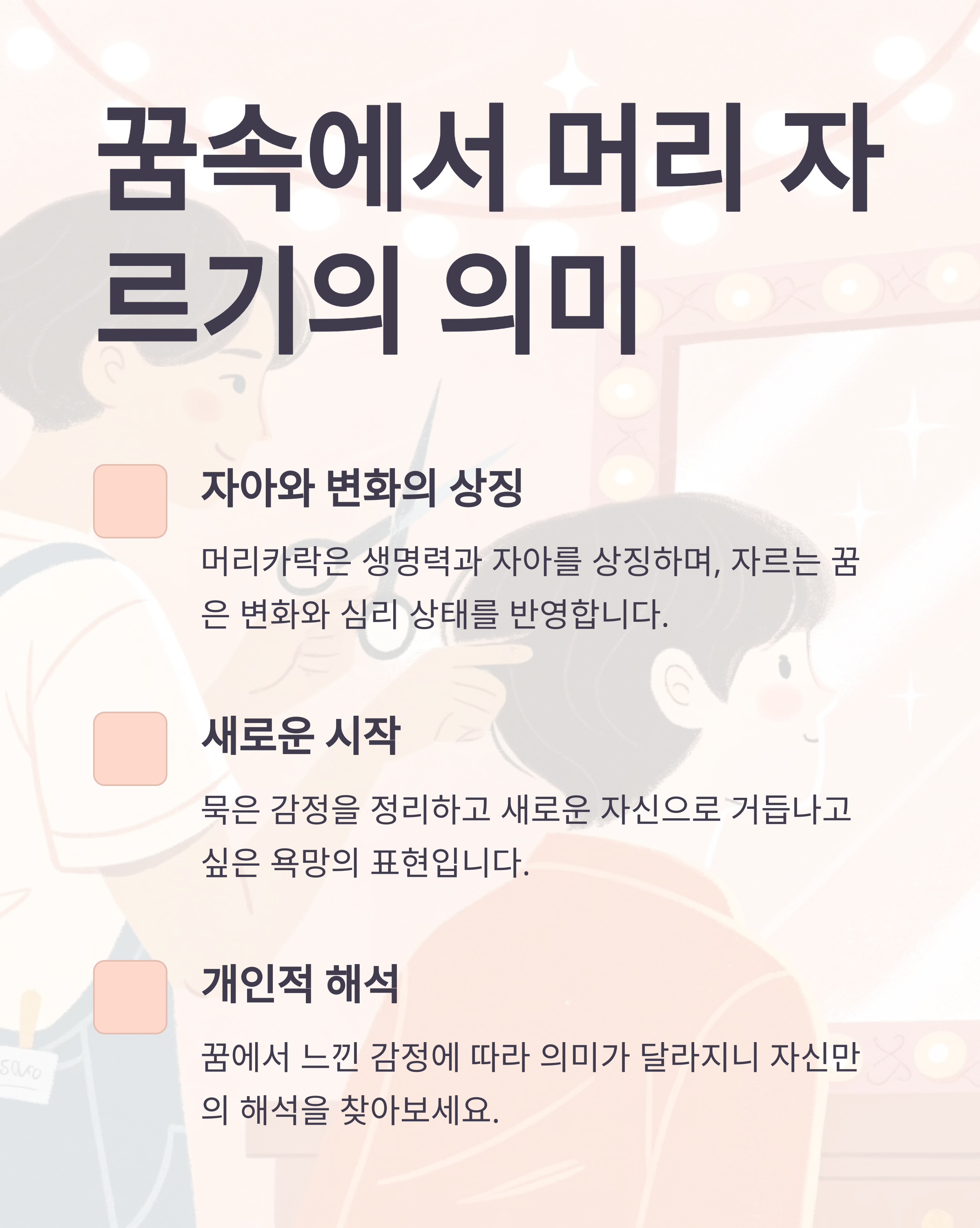 꿈속에서 머리를 자르는 경험, 혹시 최근에 있으셨나요? 단순한 꿈이라고 넘기기엔 어딘가 찜찜한 기분이 들 수도 있을 텐데요. 머리카락은 예로부터 생명력과 자아를 상징한다고 하죠. 그래서 머리 자르는 꿈은 변화, 심리 상태, 억압된 감정 등 다양한 의미를 내포하고 있을 가능성이 높습니다. 이 글에서는 머리 자르는 꿈에 대한 궁금증을 속 시원하게 풀어드리고, 꿈이 당신에게 전하려는 메시지를 해석해 드릴게요.