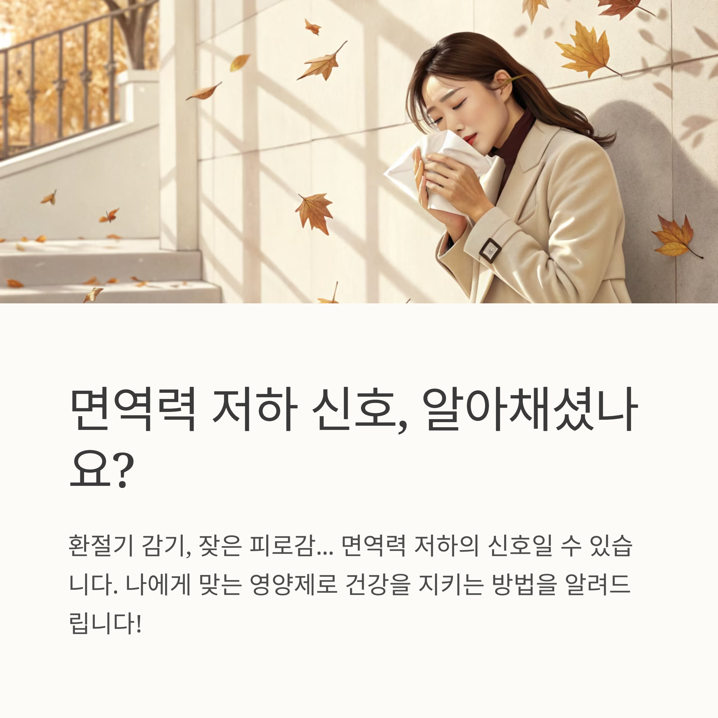 하지만 걱정하지 마세요! 면역력은 생활습관을 개선하고, 균형 잡힌 영양 섭취를 통해 충분히 회복할 수 있습니다. 특히 영양제는 부족한 영양소를 채워 면역력을 높이는 데 도움을 줄 수 있어요. 다만, 영양제는 만병통치약이 아니라는 점을 기억해야 합니다.