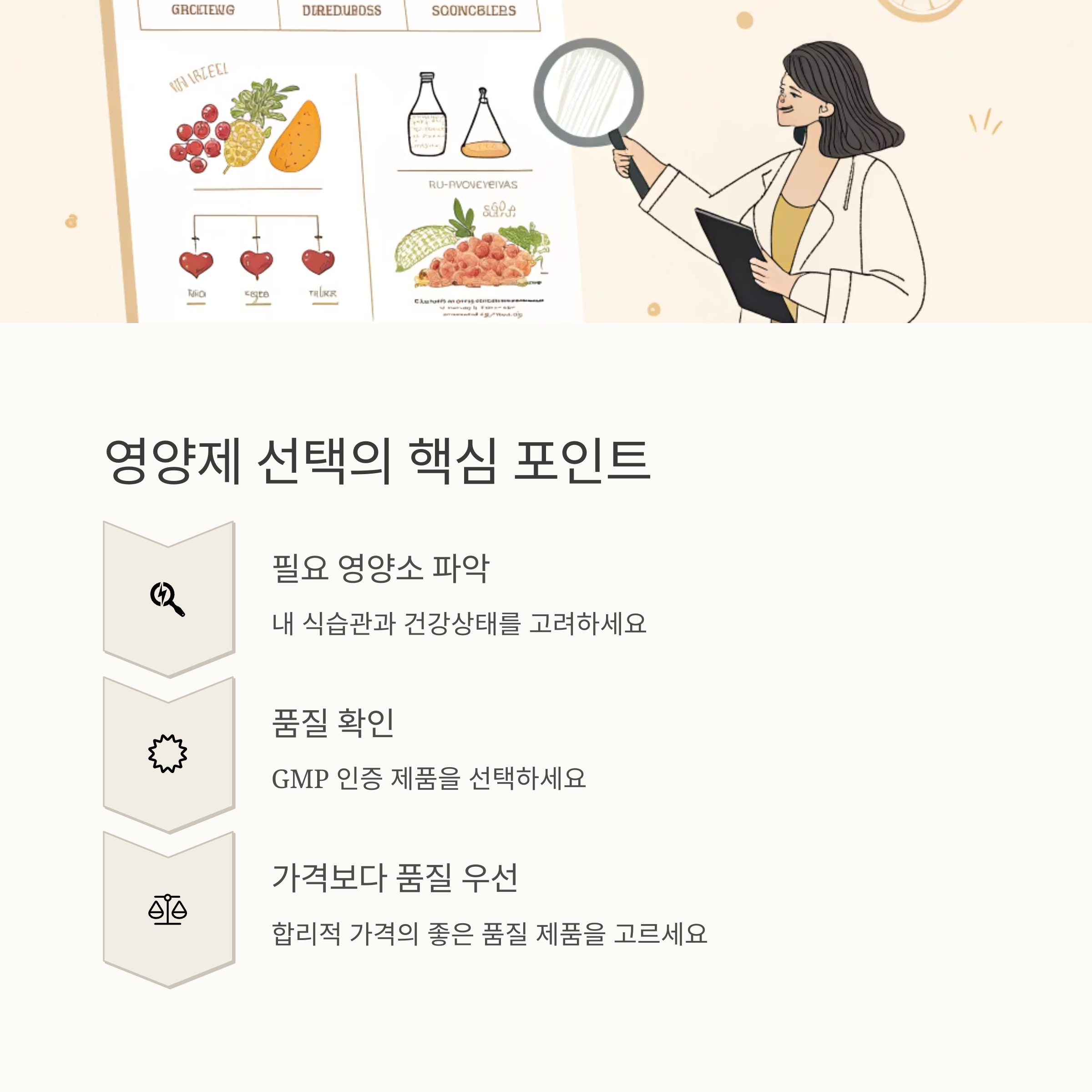면역력 향상을 위한 최고의 방법은 건강한 생활 습관을 유지하는 것이지만, 영양제는 그 과정을 좀 더 효율적으로 만들어 줄 수 있는 보조 수단이라고 생각하시면 됩니다. 우리 몸은 스스로를 지킬 수 있는 훌륭한 시스템을 가지고 있으니, 그 시스템을 잘 보조해 주는 것이 중요합니다. 다음 장에서는 영양제를 어떻게 선택해야 할지 알려드릴게요!