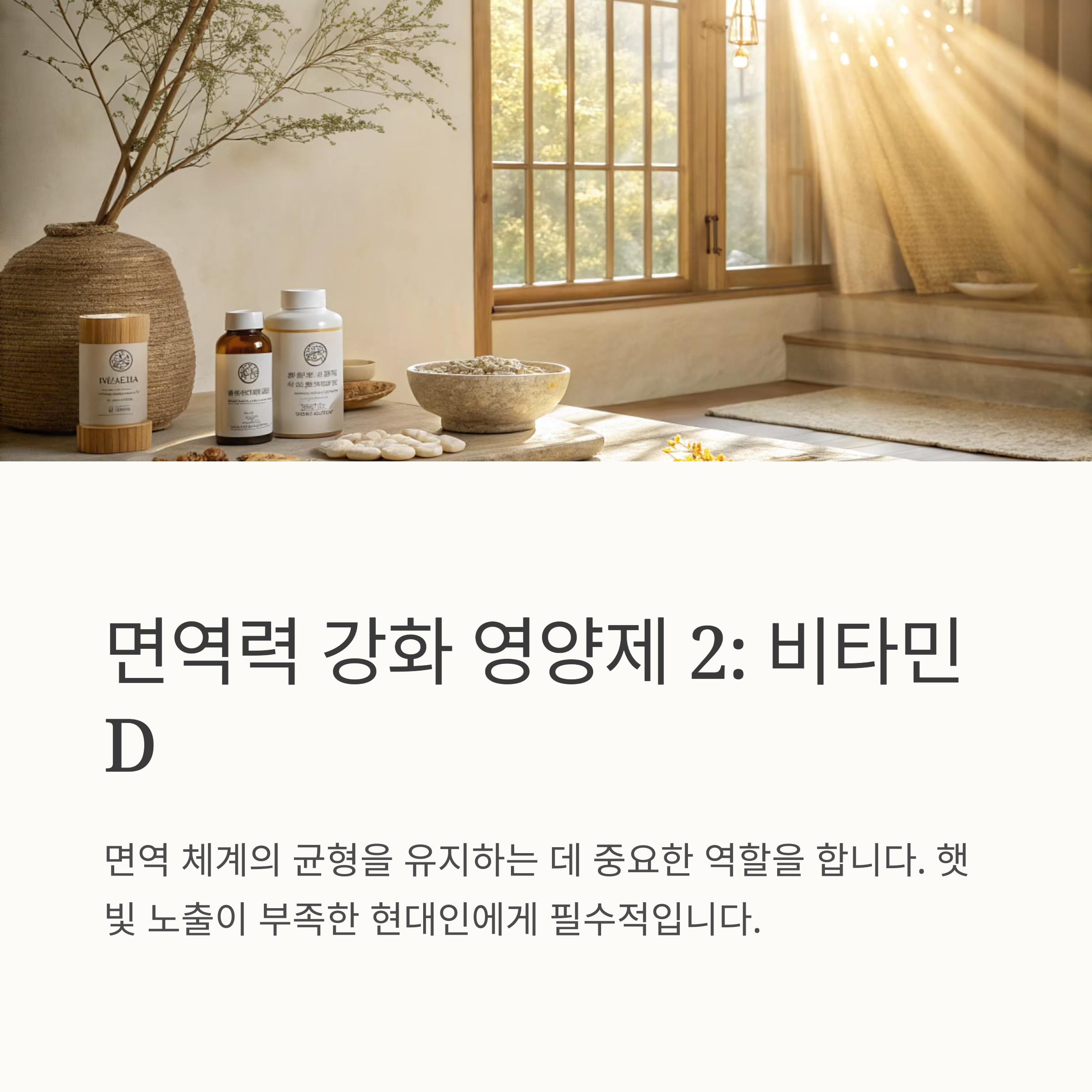 2. 비타민 D: 햇볕을 통해 얻을 수 있는 비타민 D는 면역 체계의 균형을 유지하는 데 중요한 역할을 합니다. 햇빛 노출이 부족한 현대인들에게 특히 필요한 영양소입니다.