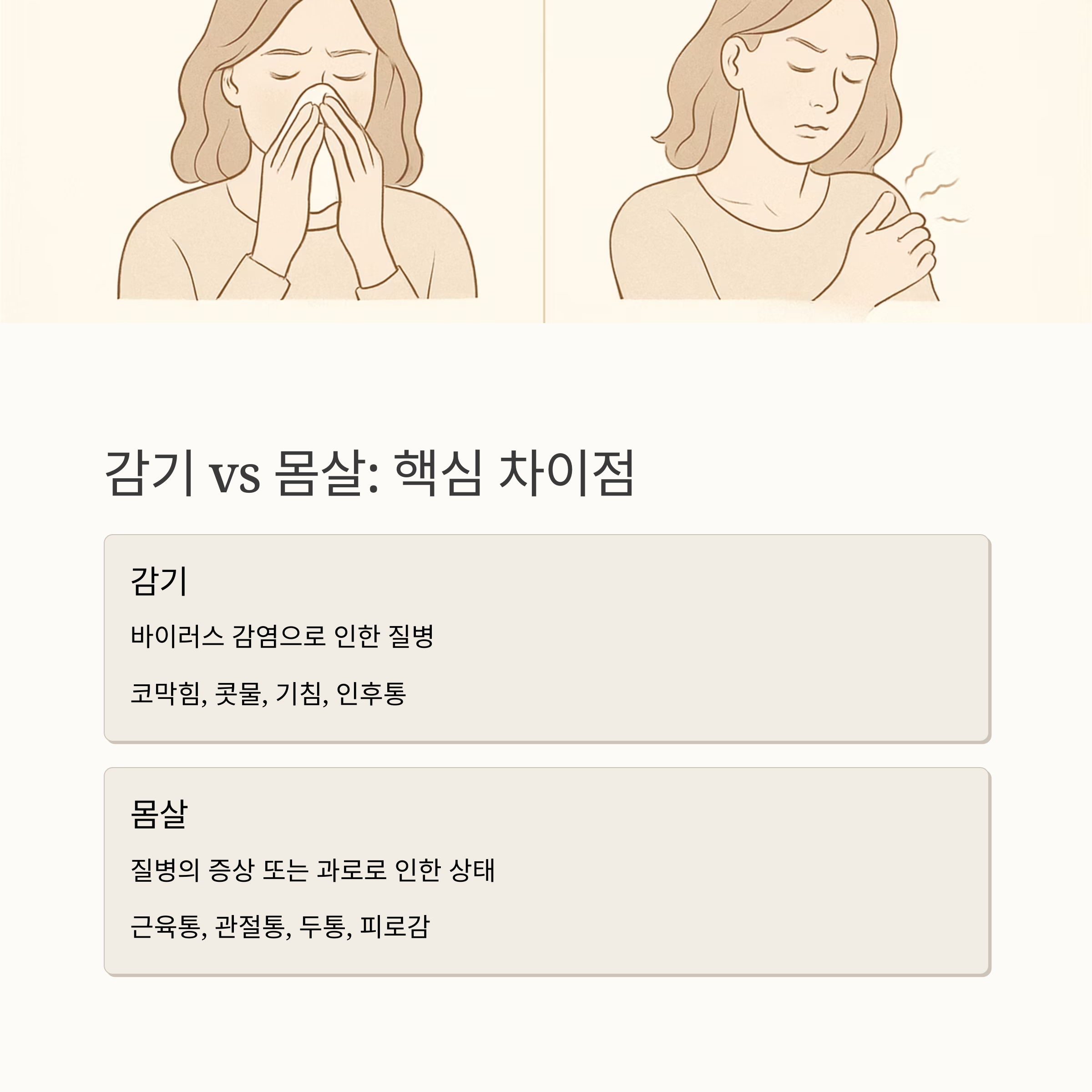 그렇다고 감기에 몸살 증상이 전혀 없다는 건 아니에요. 감기에 걸리면 몸살 증상이 동반되는 경우가 많으니까요. 하지만 몸살만 있고 감기 증상이 없다면 감기와는 별개로 생각해볼 수 있습니다. 쉽게 말해, 감기는 원인이 되는 질병이고, 몸살은 그 질병의 증상 또는 다른 원인으로 인한 증상이라고 생각하면 좀 더 명확해질 거예요. 핵심은 바로 원인과 증상의 차이입니다. 몸살의 주요 원인은 근육통이죠. 감기는 바이러스 감염, 몸살은 과로나 면역력 저하 등 다양한 요인이 원인이 될 수 있습니다.