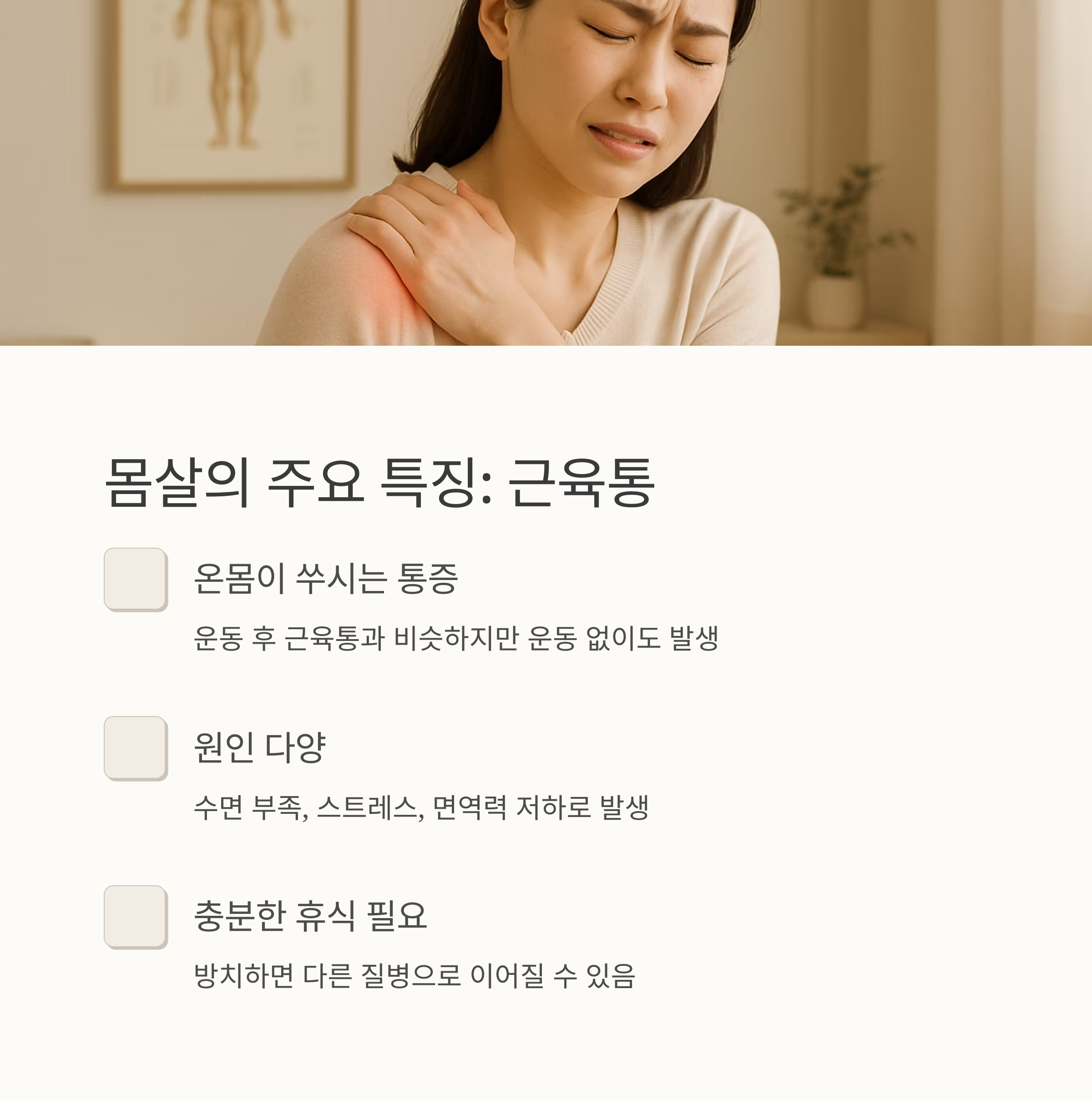 몸살 증상의 가장 큰 특징은 바로 ‘근육통’입니다. 온몸이 쑤시고 아픈 거, 바로 그게 몸살의 핵심이죠. 온몸에 젖산이 가득 차 있는 듯한 느낌, 누구나 한 번쯤 경험해봤을 만큼 흔한 증상입니다. 이 근육통은 격렬한 운동 후에 느끼는 근육통과 비슷하지만, 몸살 증상의 경우에는 특별한 운동을 하지 않았어도 발생할 수 있다는 점이 다릅니다.