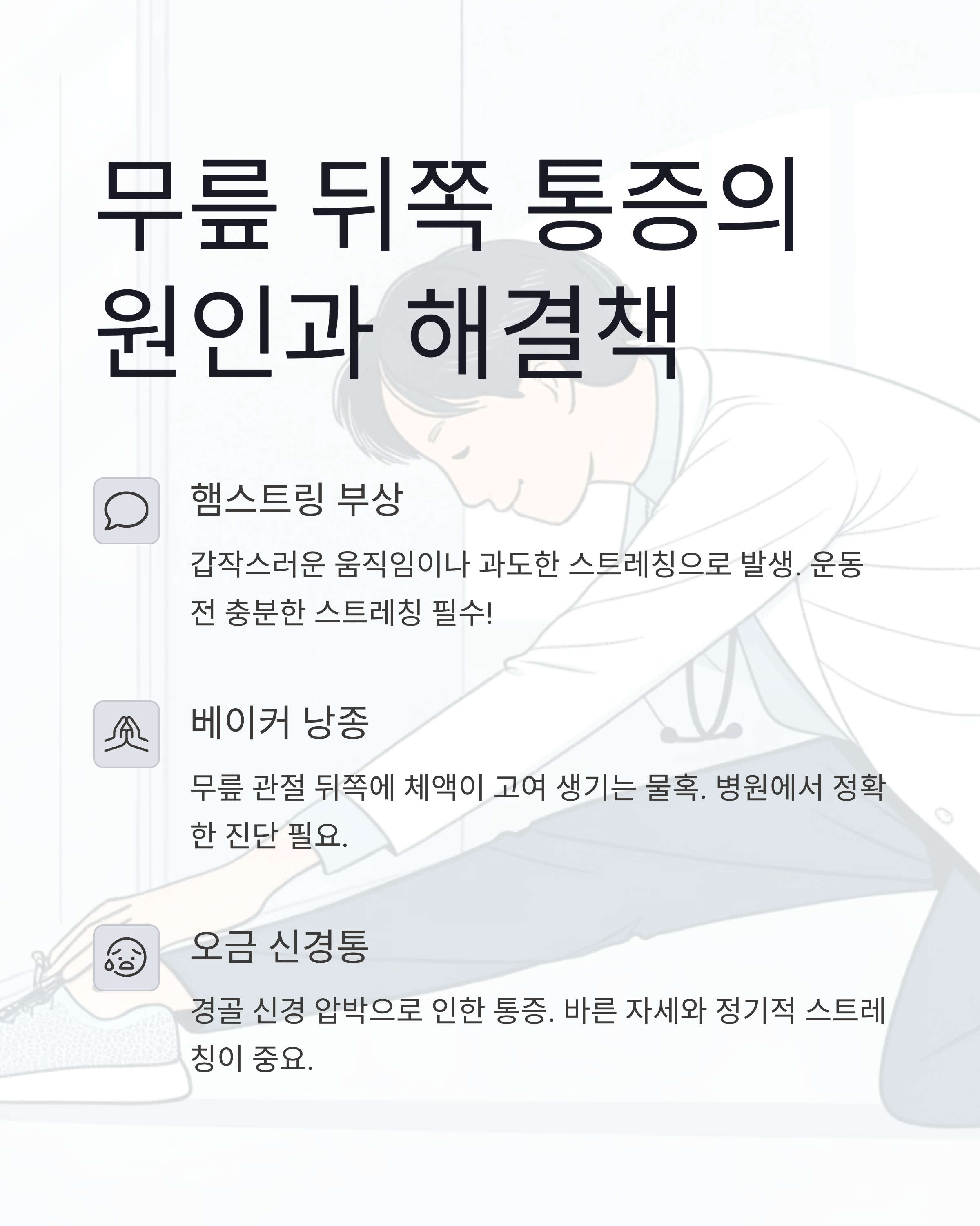 안녕하세요, 여러분! 오늘은 많은 분들이 겪는 무릎 뒤쪽 통증에 대해 속 시원하게 파헤쳐 보려고 해요. 😩 혹시 '나도?' 싶으시다면 집중! 무심코 넘겼던 뻐근함의 원인부터 시원한 해결책까지, 제가 꼼꼼하게 알려드릴게요.