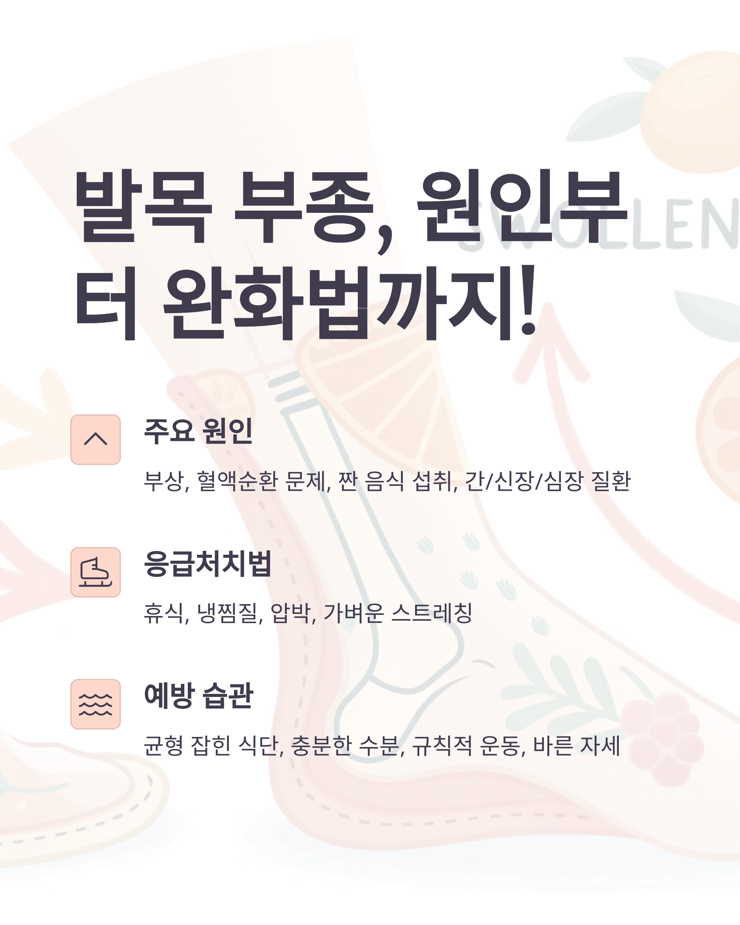 안녕하세요! 오늘은 많은 분들이 겪는 흔한 불편함, 바로 발목 부종에 대해 이야기해보려고 합니다. 저 또한 발목이 붓는 경험이 잦아서 얼마나 답답하고 불편한지 잘 알고 있습니다. 그래서 오늘은 발목 부종의 원인부터 완화 방법, 관련 질환, 그리고 예방 습관까지 속 시원하게 알려드릴게요. 함께 발목 건강을 지켜봐요!