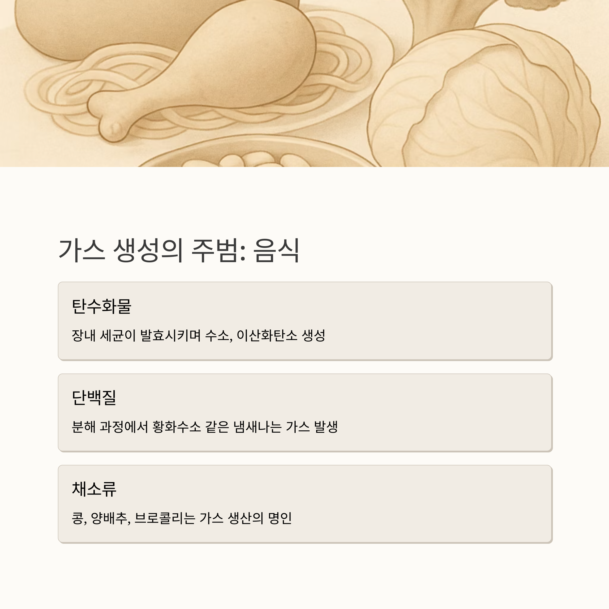 일단, 우리가 먹는 음식의 종류가 중요해요. 탄수화물, 단백질, 지방… 이 영양소들은 소화 과정에서 각각 다른 방식으로 분해되면서 가스를 만들어내거든요. 특히 콩, 양배추, 브로콜리 같은 채소는 가스 생산의 명인이라고 할 수 있어요. 소화가 잘 안 되는 탄수화물은 장 속 세균들이 열심히 발효시키면서 수소나 이산화탄소 같은 가스를 만들어내고, 단백질이 분해될 때도 황화수소처럼 냄새까지 나는 가스가 생길 수 있답니다.