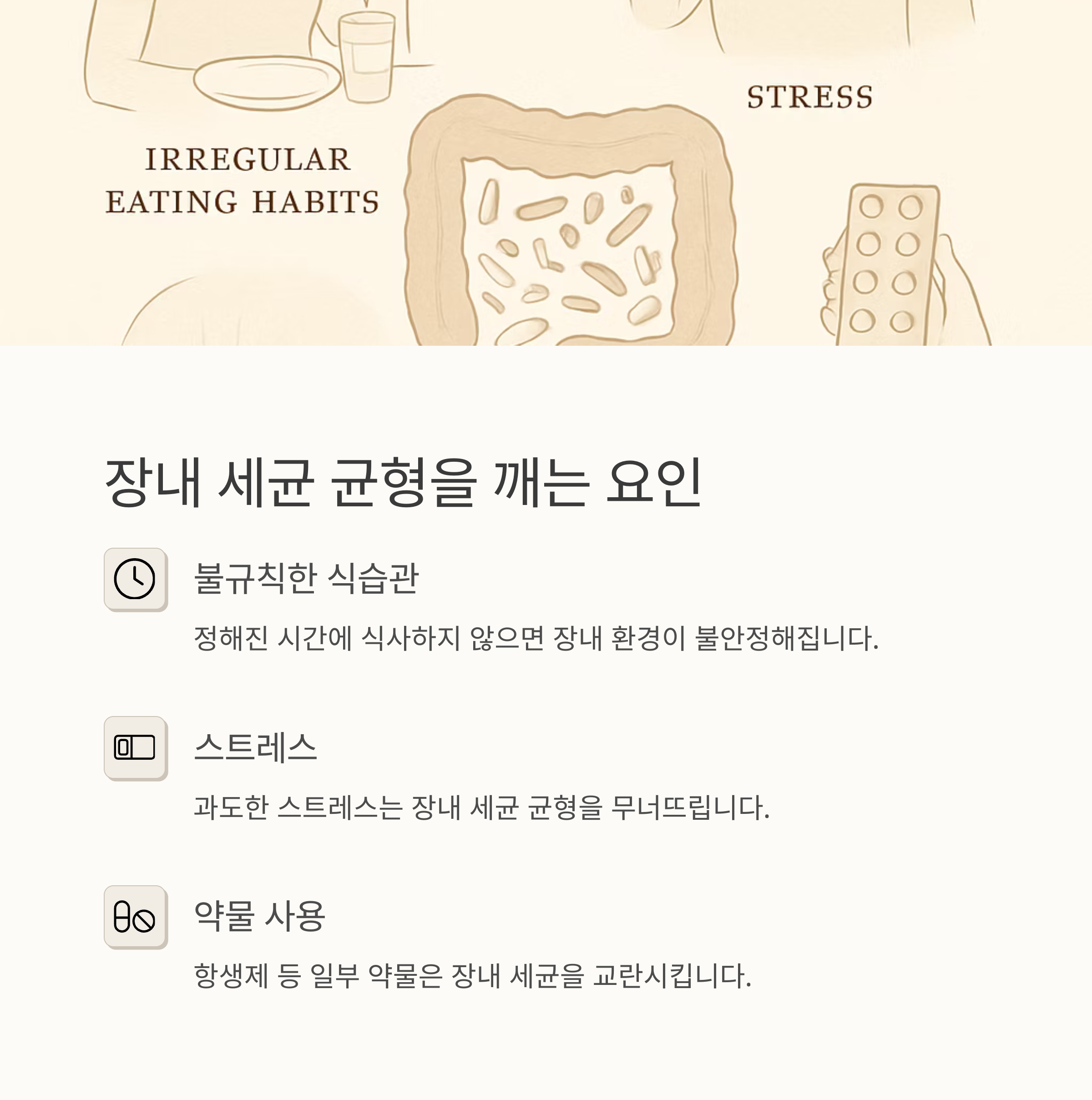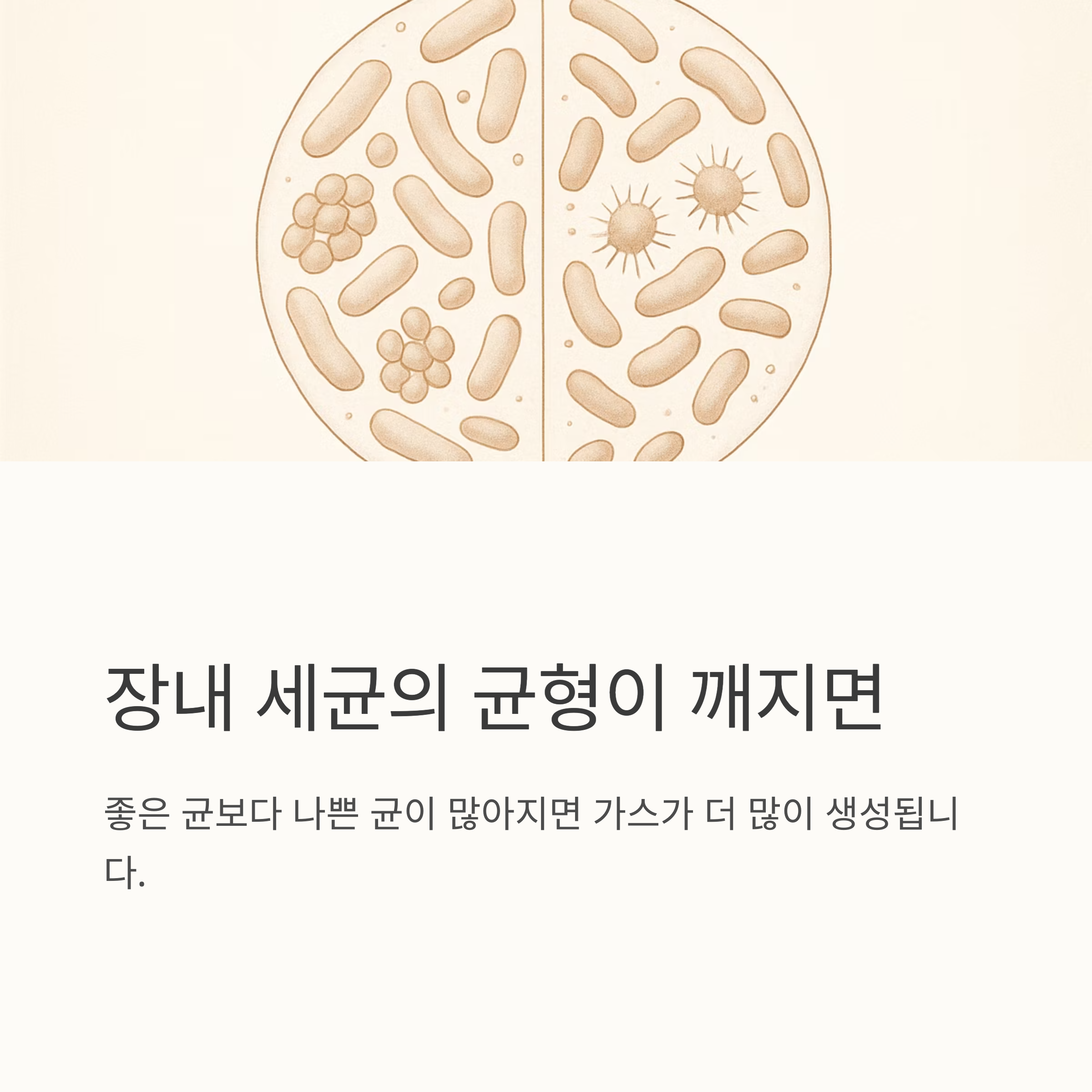 여기에 장내 세균들의 균형까지 깨지면 가스 생산 공장이 과열되는 거죠. 좋은 균보다 나쁜 균이 많아지면 가스는 더욱더 많아지고, 힘들어지는 거예요. 평소 식습관이 불규칙하거나 스트레스를 많이 받으면 장내 세균의 균형이 쉽게 깨진답니다.