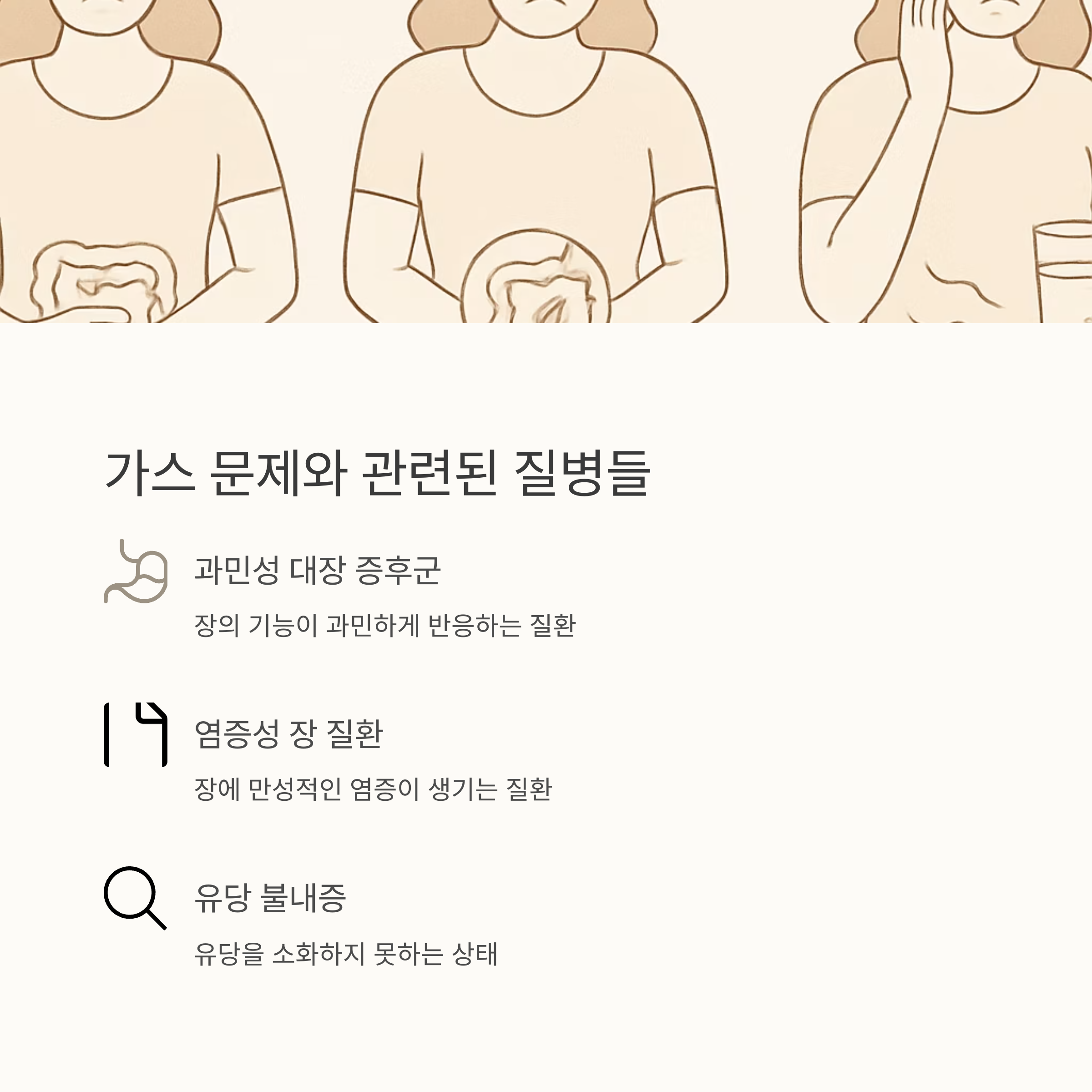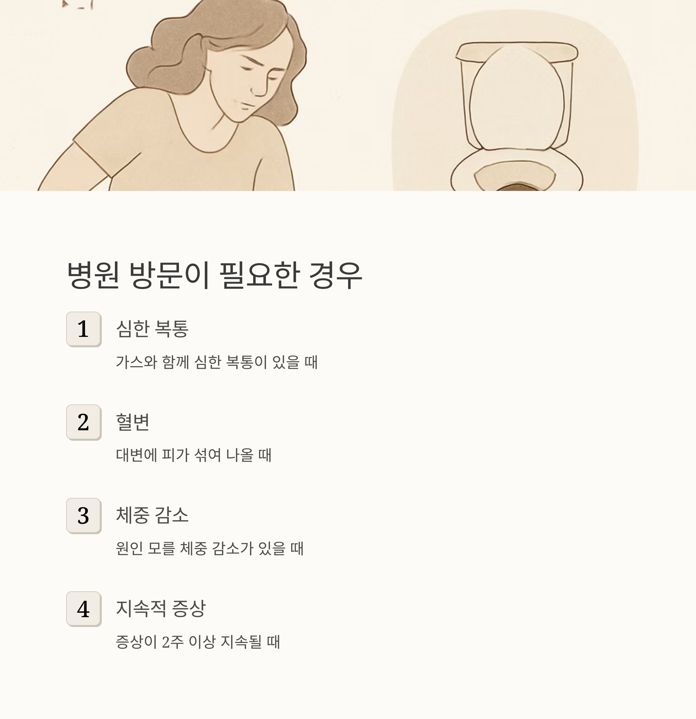 생활 습관 개선과 간단한 방법으로도 해결되지 않는 만성적인 가스 문제는 병원에 가서 검사를 받아봐야 해요. 가스와 함께 심각한 증상, 예를 들어 심한 복통, 혈변, 체중 감소 등이 있다면 더욱 빨리 병원에 가야 합니다.