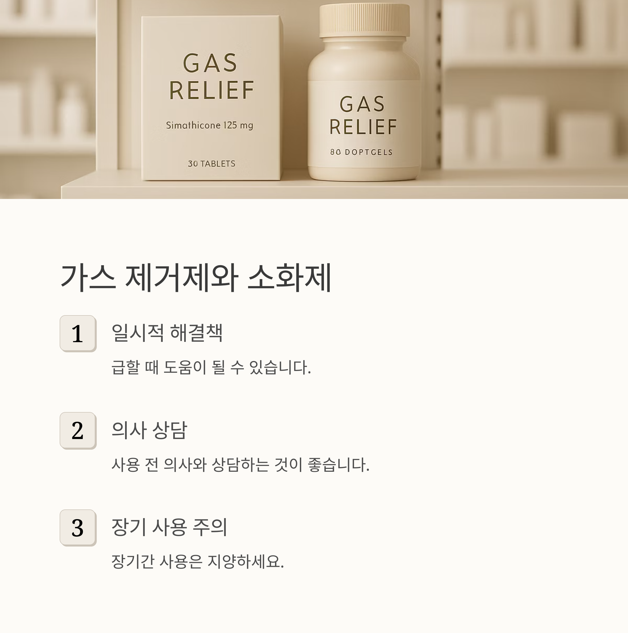 약국에서 파는 가스 제거제나 소화제를 복용하는 것도 일시적인 해결책이 될 수 있지만, 의사와 상담 후 사용하는 것이 좋고 장기간 사용은 지양하는 게 좋아요. 프로바이오틱스나 프리바이오틱스 같은 유익균을 섭취하는 것도 장 건강에 도움이 되니 고려해볼 만합니다.
