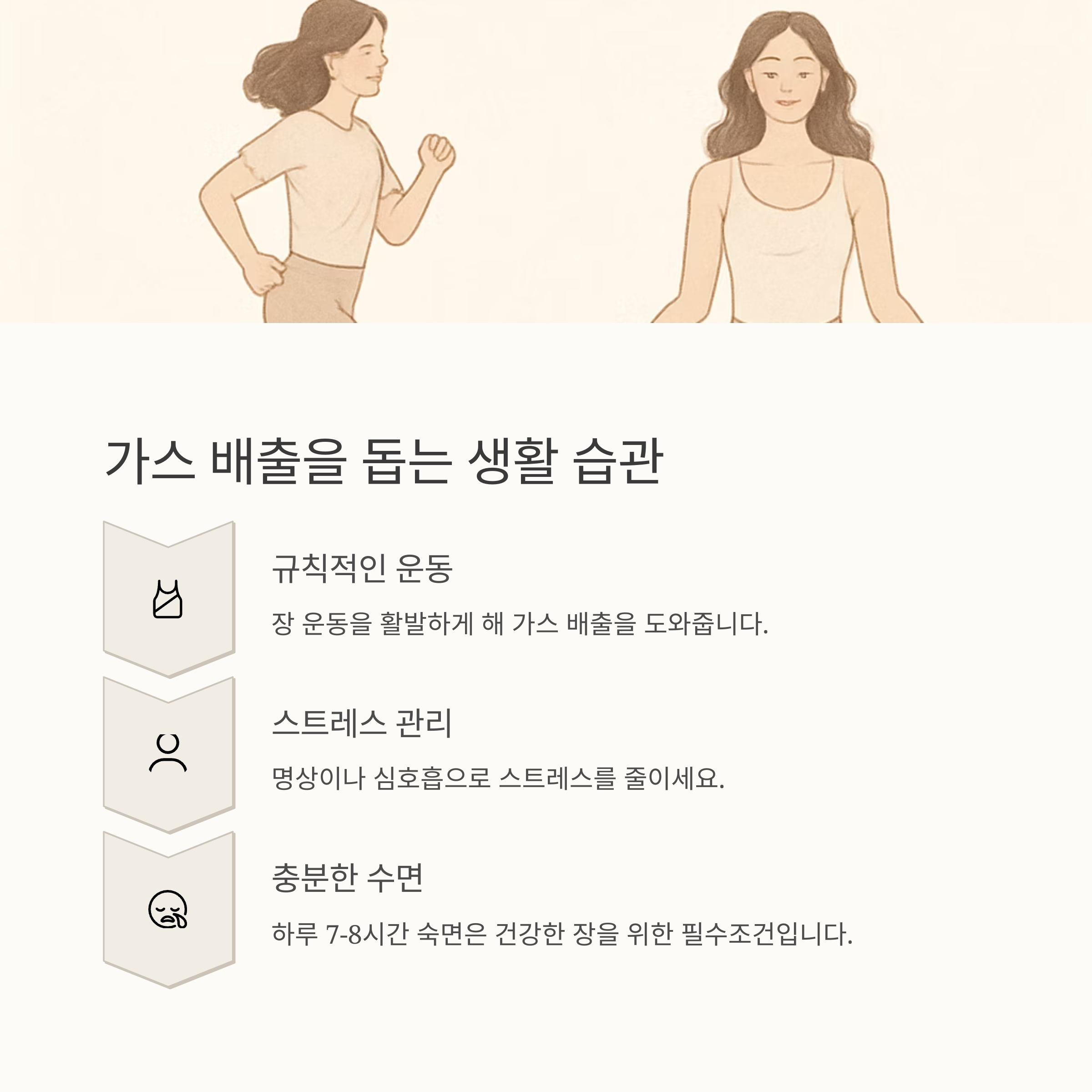 잠을 제대로 못 자면 소화 기능이 떨어지고 가스 문제가 더 심해질 수 있거든요. 하루 7-8시간 숙면은 건강한 장을 위한 필수 조건이에요. 그리고 바른 자세를 유지하는 것도 중요해요! 구부정한 자세는 소화에 방해가 되거든요.