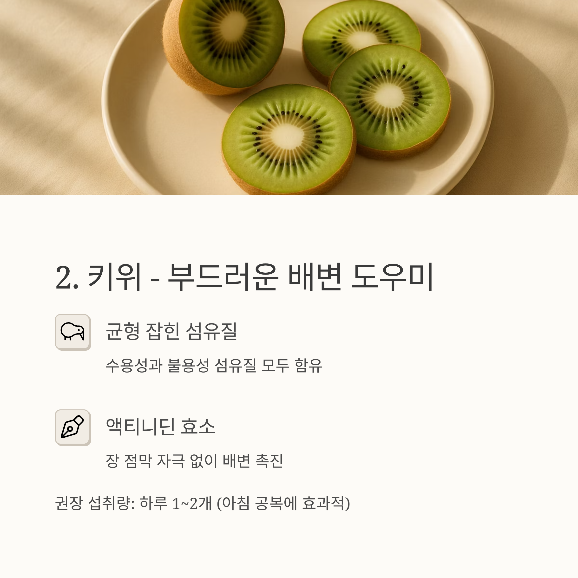키위는 수용성과 불용성 섬유질이 골고루 들어있고, 액티니딘이라는 효소까지 함유하고 있어요. 장 점막을 자극하지 않고 부드럽게 배변을 돕죠. 아침 공복에 먹으면 더욱 효과적이라고 합니다. 하루 1~2개면 충분해요.