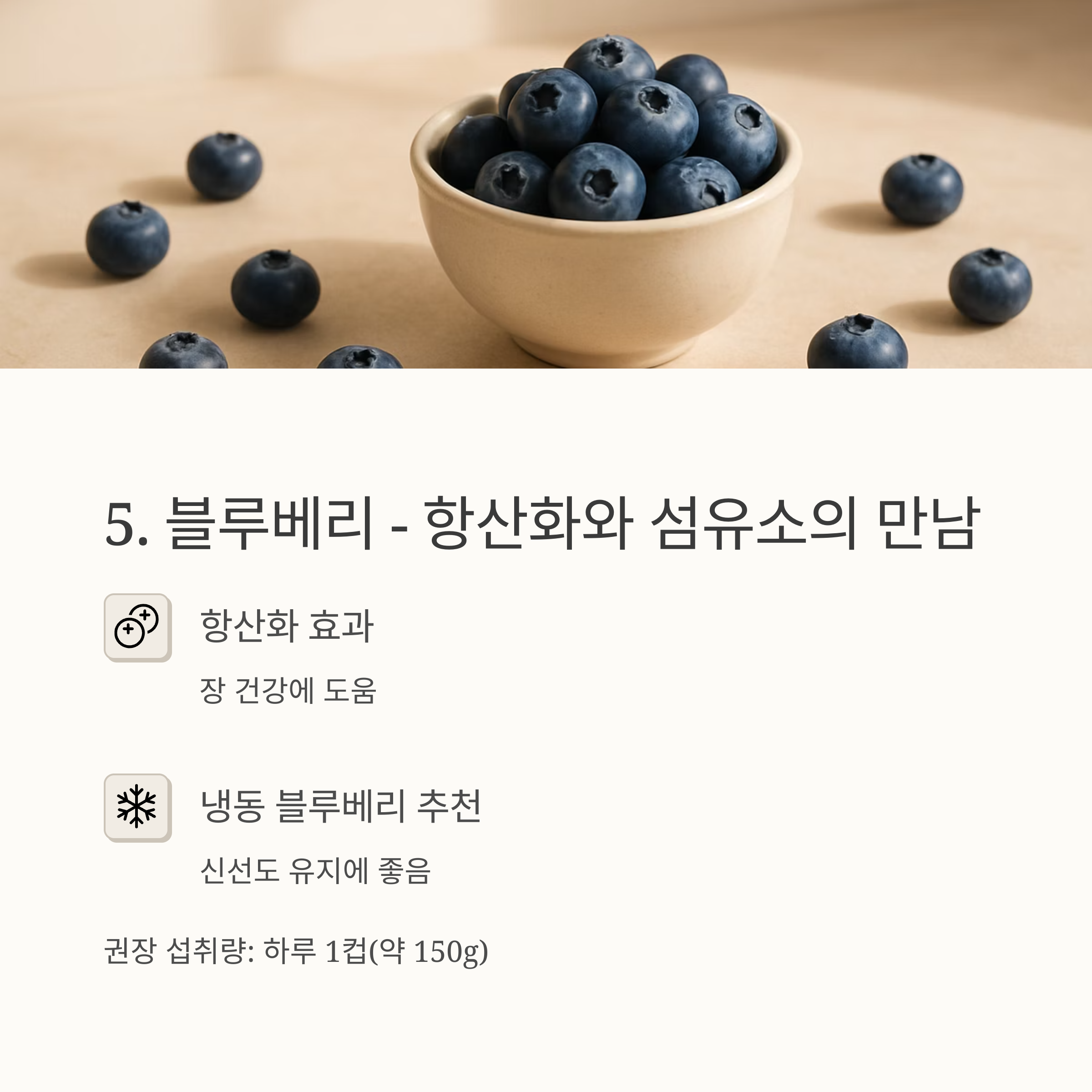 블루베리는 항산화 효과도 뛰어나고 섬유소도 풍부해 장 건강에 탁월해요. 특히 냉동 블루베리는 신선도가 높아 더 좋답니다. 하루 1컵(약 150g)정도 섭취하면 좋아요.