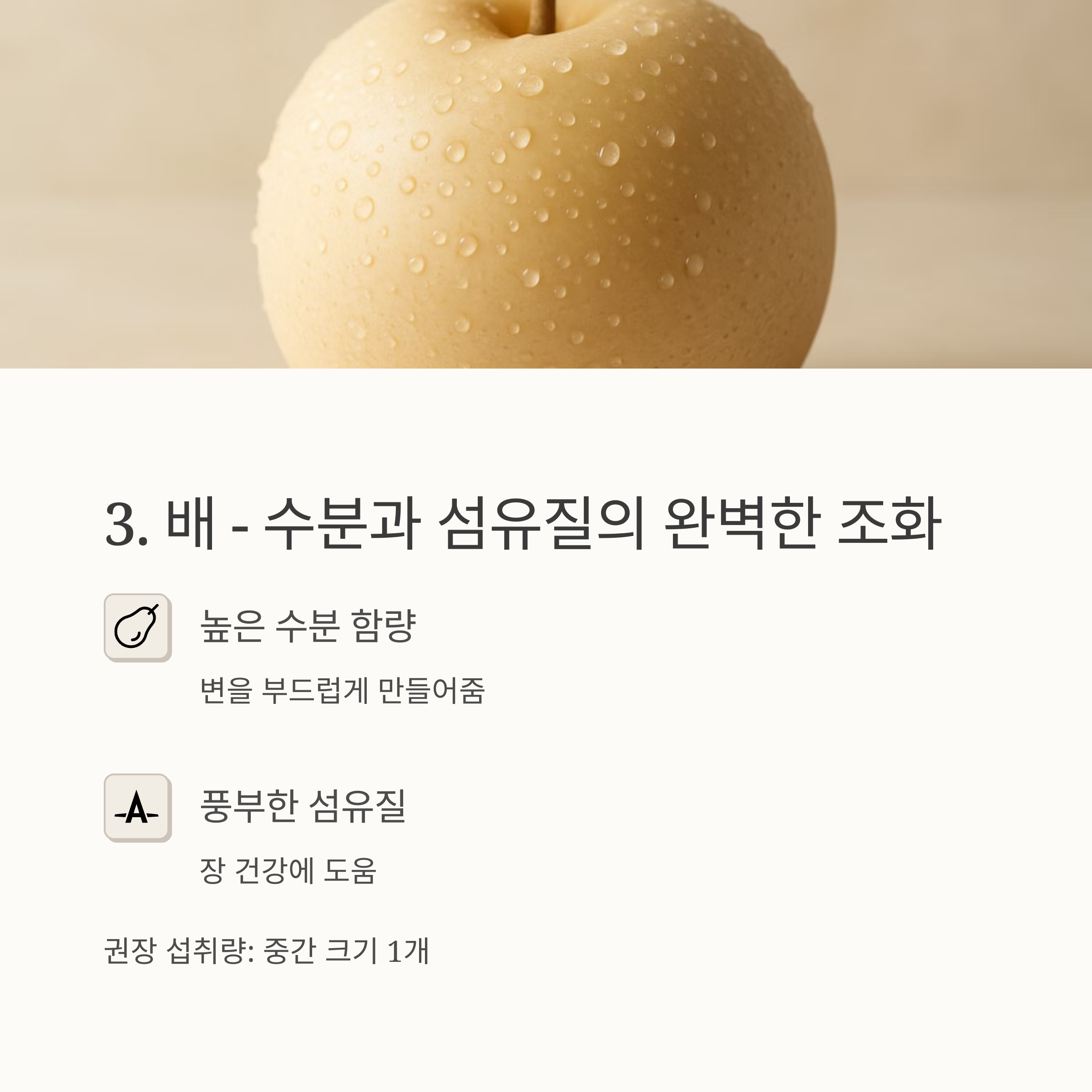 배는 수분 함량이 높아 변을 부드럽게 하는데 최고예요! 섬유질도 풍부하니 일석이조죠. 중간 크기 1개 정도면 딱 좋아요.