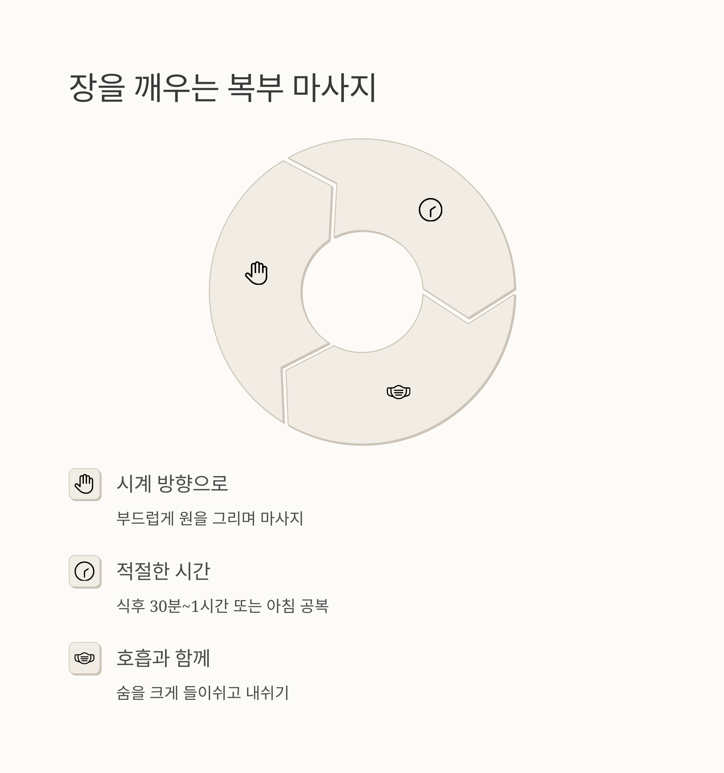 손으로 부드럽게 배를 시계 방향으로 마사지해보세요. 너무 세게 누르지 말고, 부드럽게 원을 그리듯이 마사지하는 게 중요합니다. 마치 아기를 어르듯이 말이죠. 식후 30분~1시간 정도 지나서, 또는 아침 공복에 하는 것이 좋다고 해요.