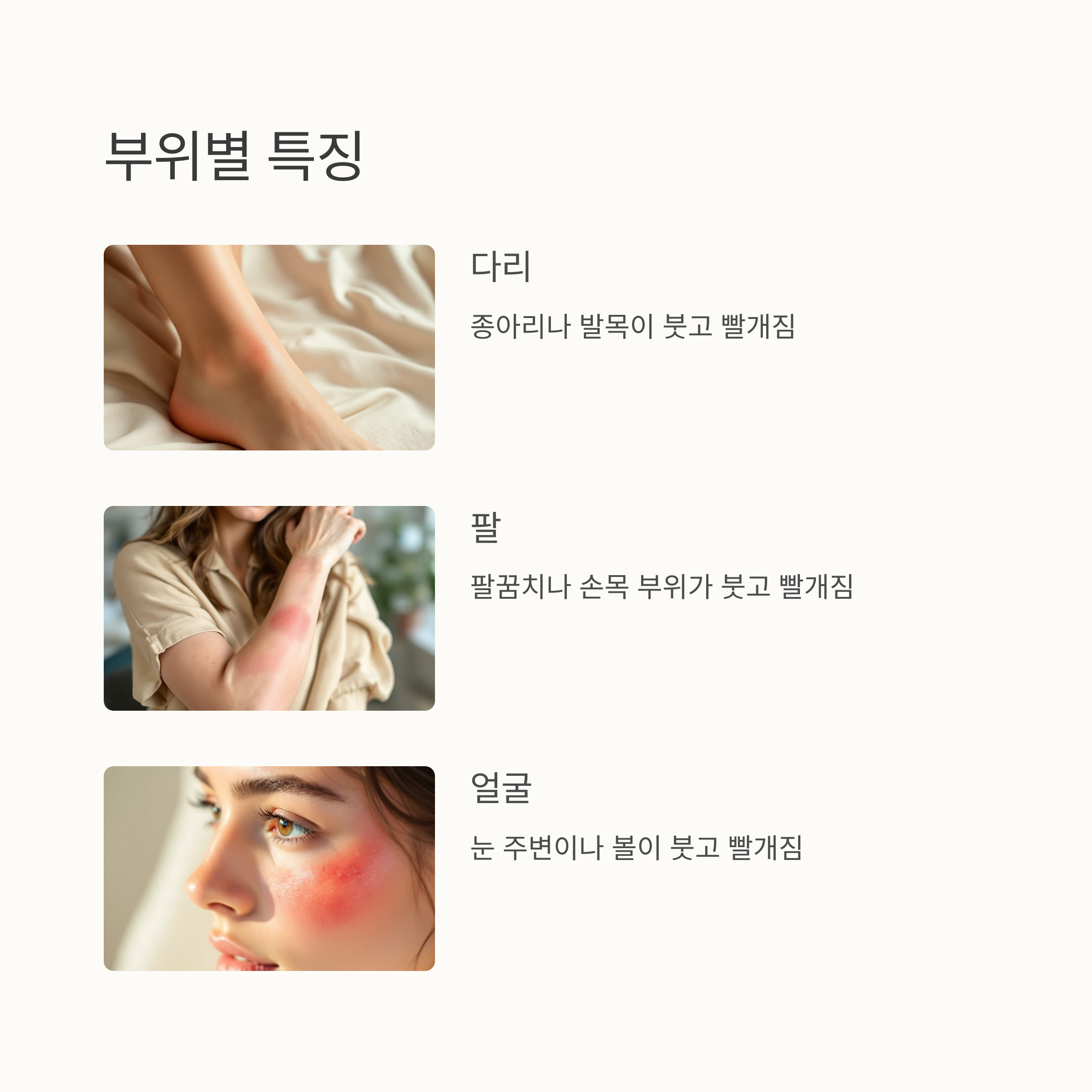 부위별로 살펴보면, 다리에 생기면 종아리나 발목이 붓고 빨갛게 변하는데, 심하면 발가락까지 퍼지기도 해요. 팔에 생기면 팔꿈치나 손목 부위가 붓고, 얼굴에 생기면 눈 주변이나 볼이 붓고 빨개져요. 얼굴에 생기는 봉와직염은 특히 위험한데, 뇌로 감염이 퍼질 수 있기 때문이에요.