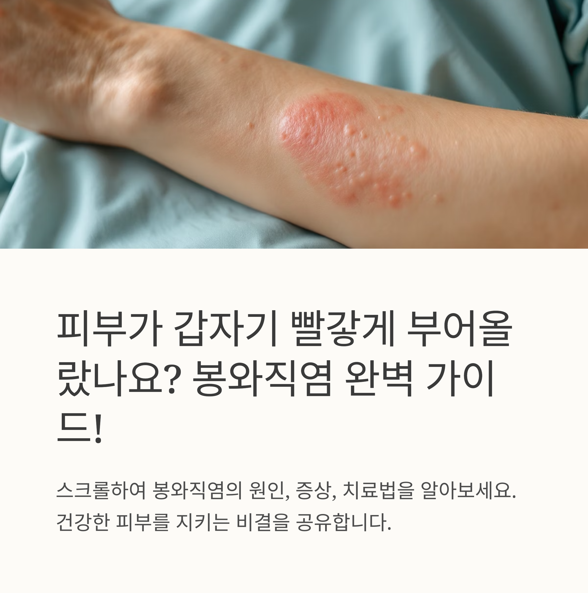 안녕하세요! 피부에 갑자기 빨갛게 부어오르고 아픈 경험, 한 번쯤 있으시죠? 오늘은 봉와직염이라는 질환에 대해 속 시원하게 알려드릴게요. 이 글을 읽고 나면 봉와직염을 예방하고 관리하는 방법을 익히실 수 있을 거예요. 함께 건강한 피부 지키도록 노력해봐요!