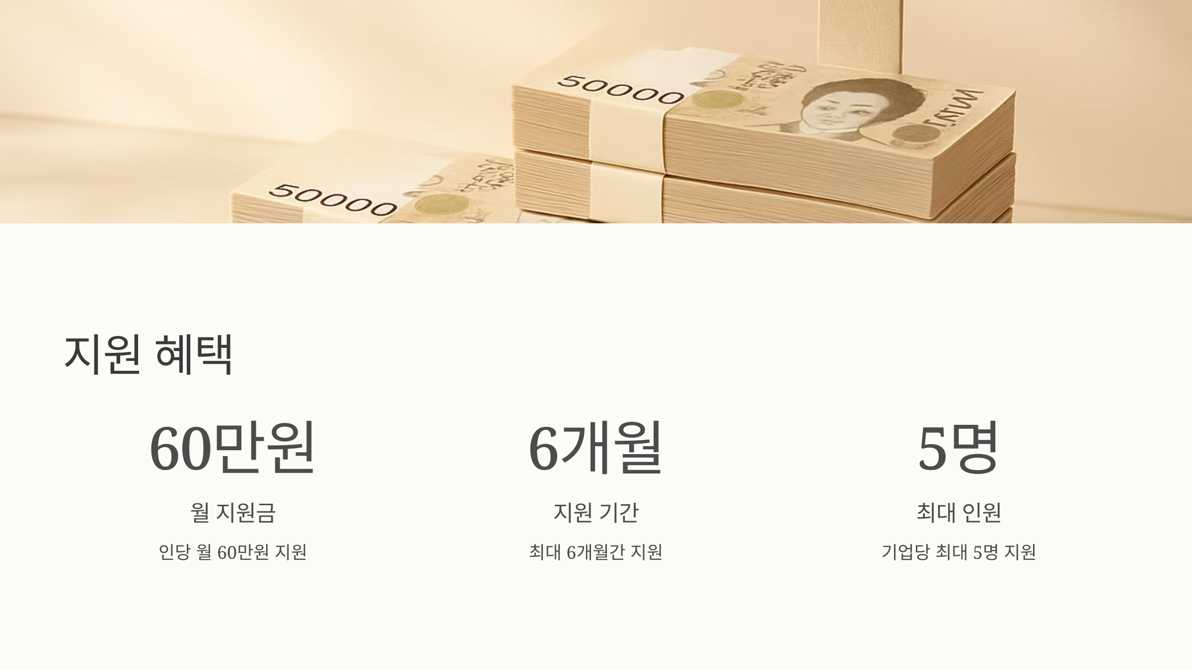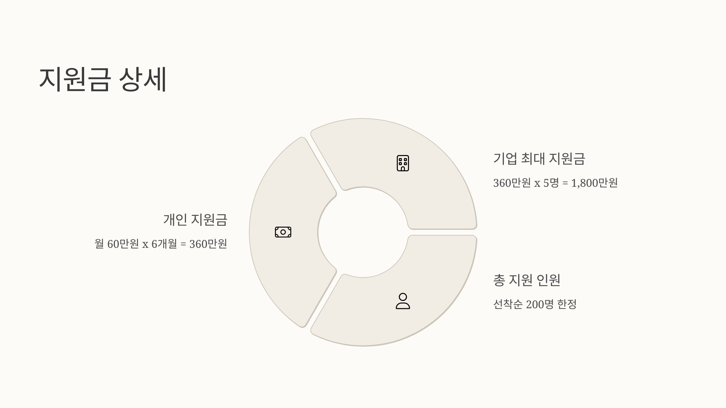 자, 이제 핵심 질문! 얼마나 지원받을 수 있을까요? 1인당 월 60만 원씩, 최대 6개월 동안 지원받을 수 있으니 총 360만 원입니다. 한 기업에서 최대 5명까지 지원이 가능하다는 점!