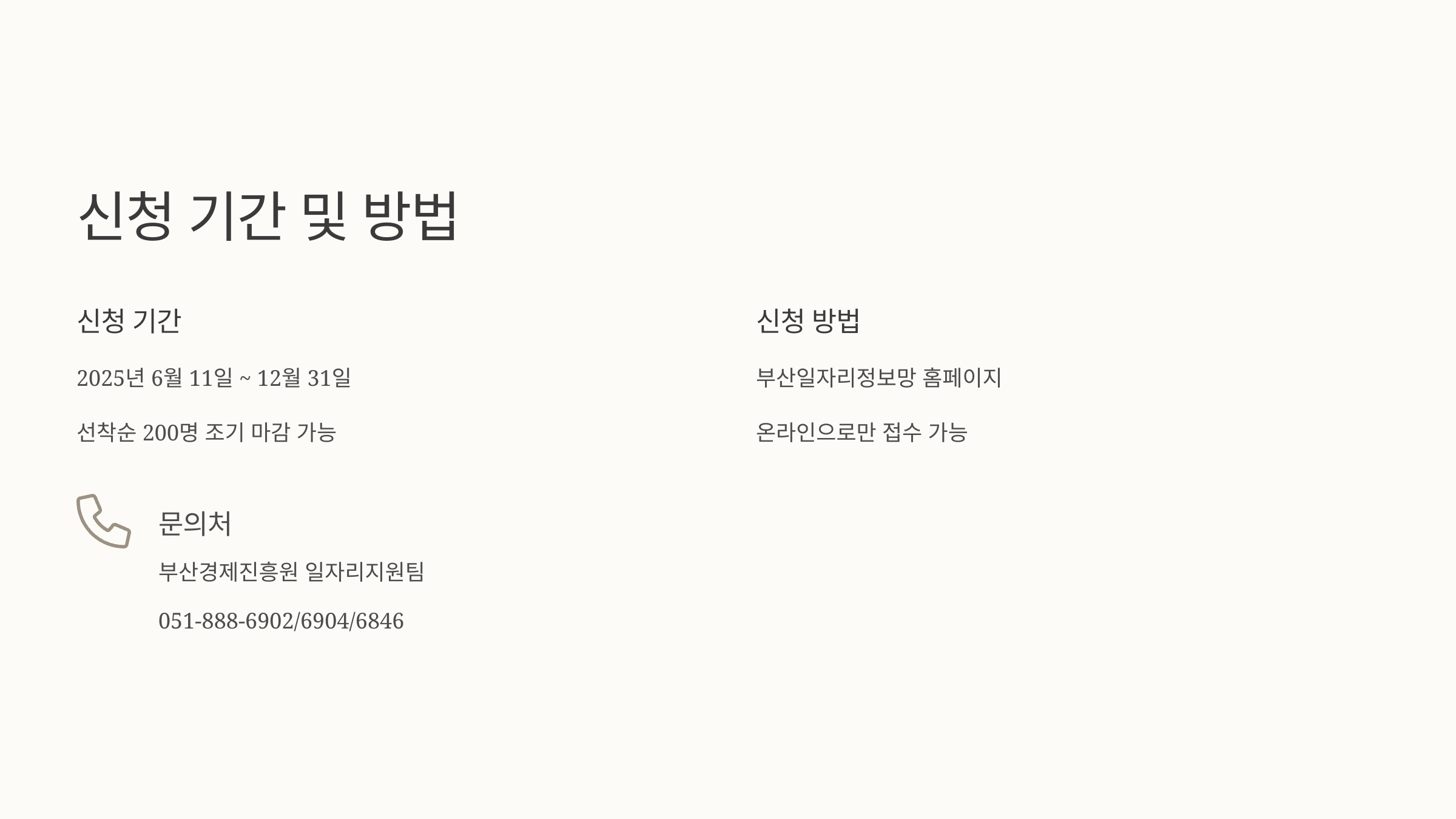 신청 기간은 2025년 6월 11일부터 12월 31일까지이며, 부산일자리정보망 홈페이지에서 신청 가능합니다. 문의사항은 부산경제진흥원 일자리지원팀 (051-888-6902 / 6904 / 6846)으로 연락 주세요. 어렵지 않죠?