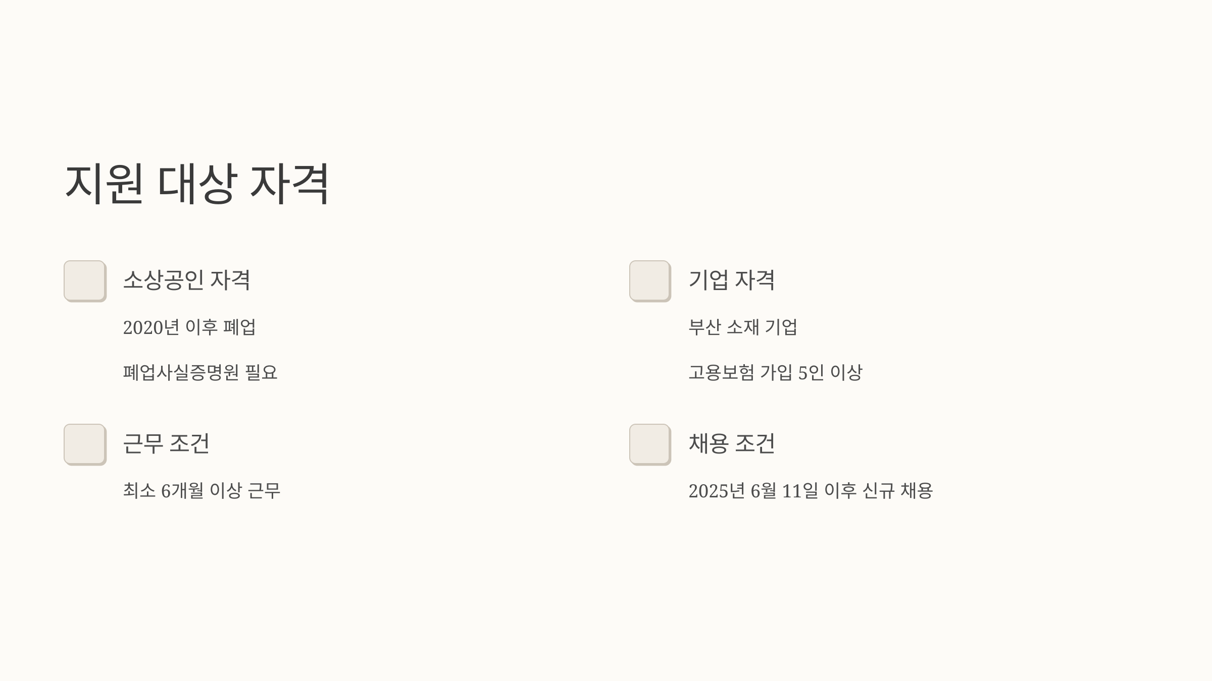 그리고 2025년 6월 11일 이후에 폐업 소상공인을 신규 채용해야 자격이 주어져요. 자격 조건에 모두 해당되시나요? 그렇다면 지금 바로 신청하세요! 어려운 절차는 없으니 편안한 마음으로 신청해 주세요. 이 지원 사업은 여러분의 재기를 위한 소중한 기회입니다. 지금 바로 도전해 보세요!