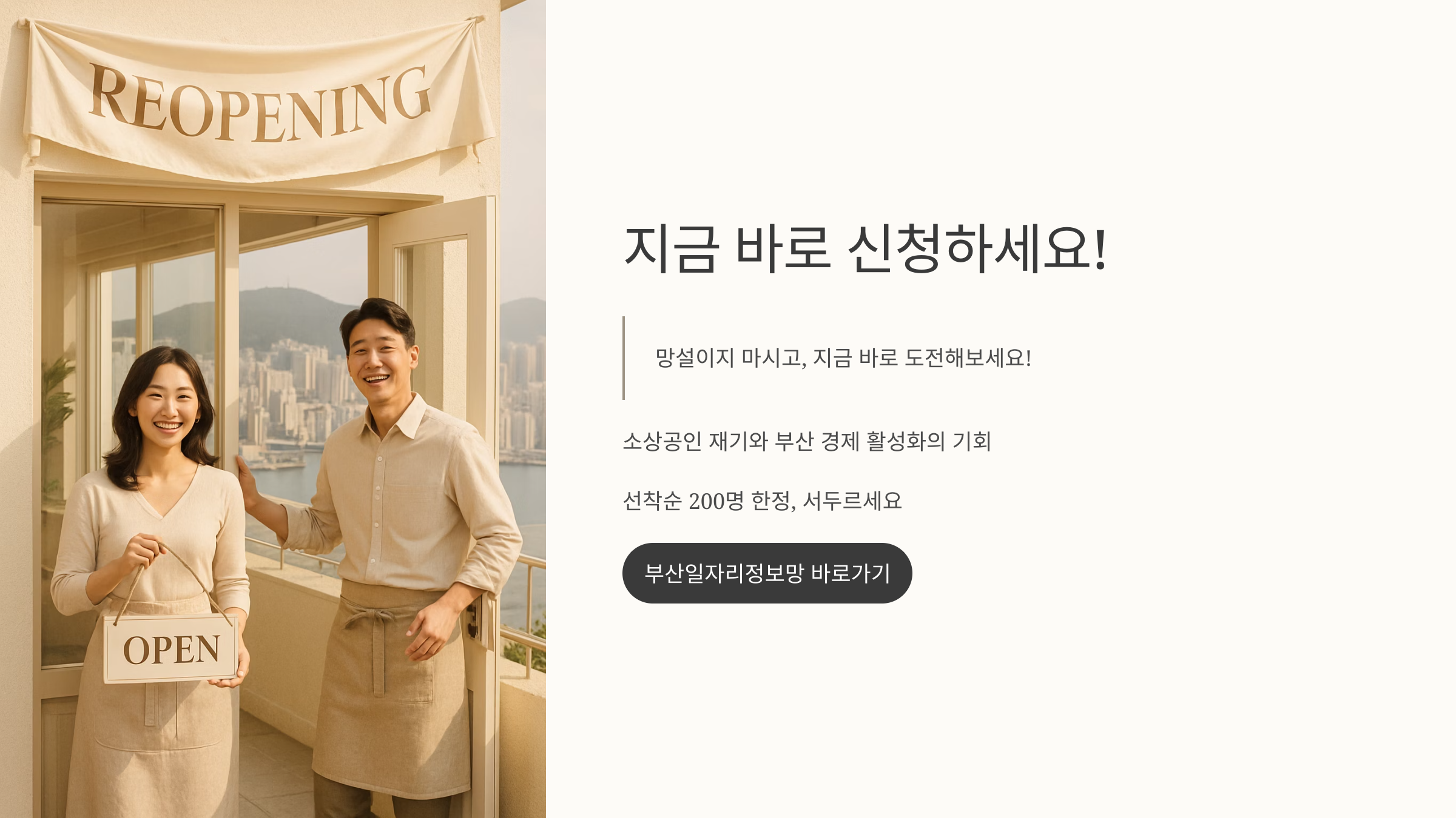 이 사업을 통해 많은 소상공인들이 다시 일어서고, 부산 지역 경제 활성화에도 큰 도움이 될 것이라고 확신합니다. 망설이지 마시고, 지금 바로 도전해 보세요!
