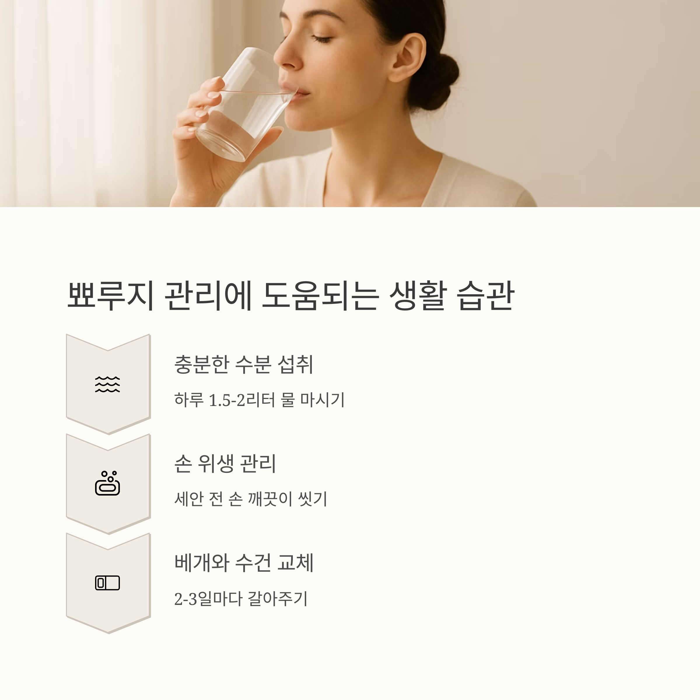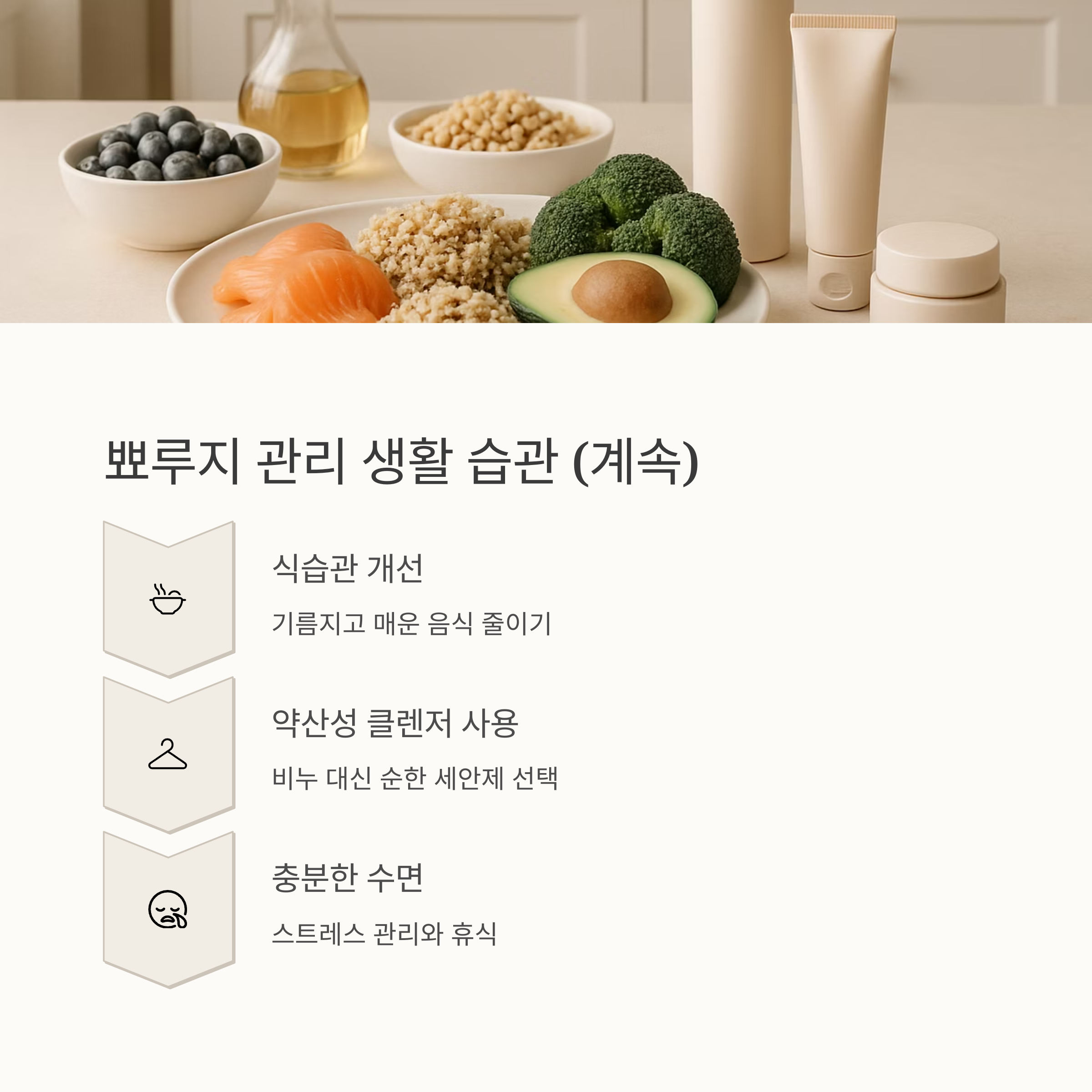 뾰루지를 예방하고 관리하려면 생활 습관 개선이 중요해요. 먼저 수분 섭취를 충분히 해야 해요. 하루에 물을 1.5-2리터 이상 마시면 피부 장벽이 강화된답니다. 두 번째는 손을 자주 깨끗하게 씻는 거예요.