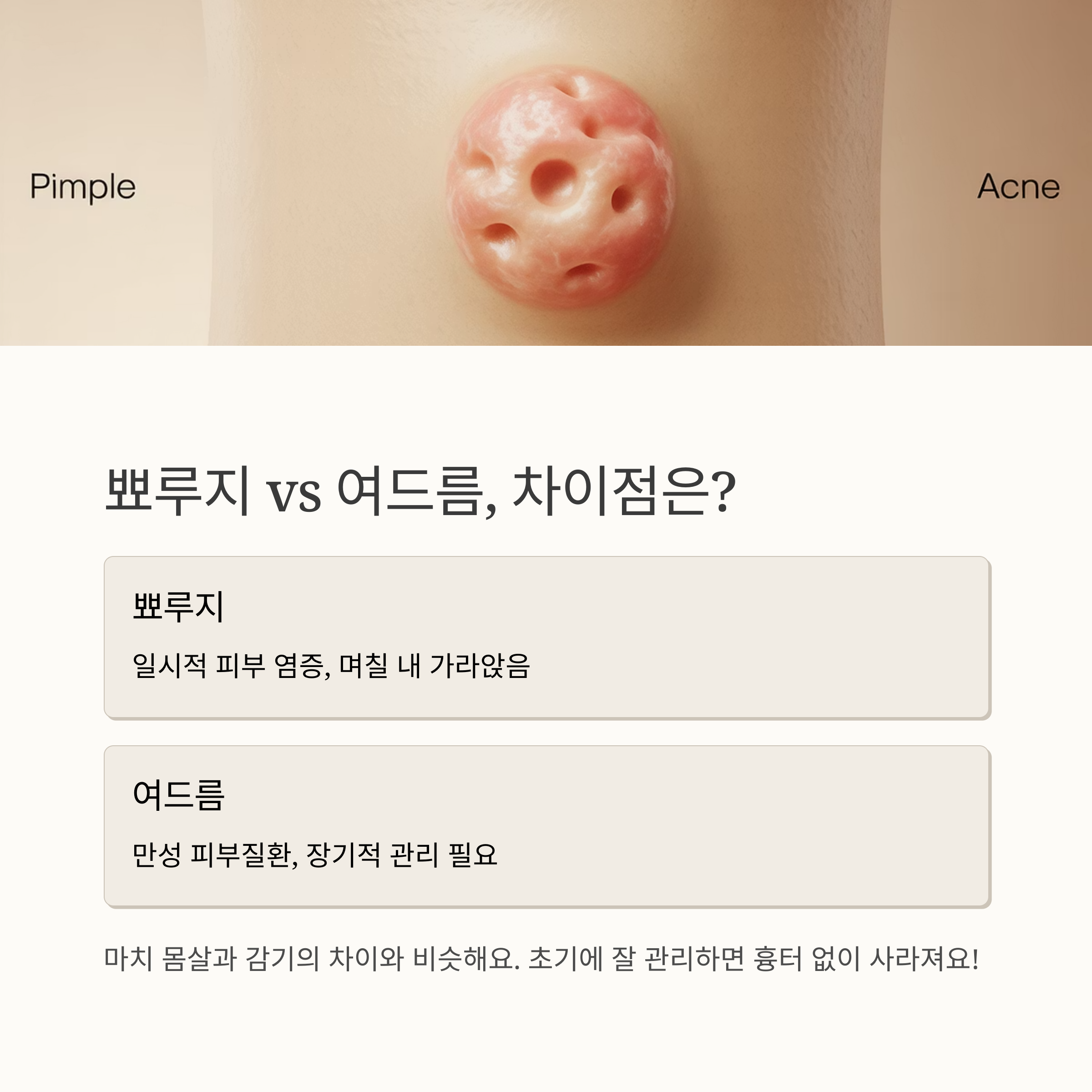 뾰루지와 여드름, 비슷해 보이지만 사실 조금 달라요. 여드름은 피지선과 모낭에 염증이 생긴 만성 질환이라고 생각하면 돼요. 오랫동안 꾸준히 관리해야 하는 질환이죠. 반면 뾰루지는 좀 더 넓은 개념으로, 외부 자극이나 스트레스, 호르몬 변화 등 다양한 이유로 갑자기 생기는 일시적인 피부 염증이에요.