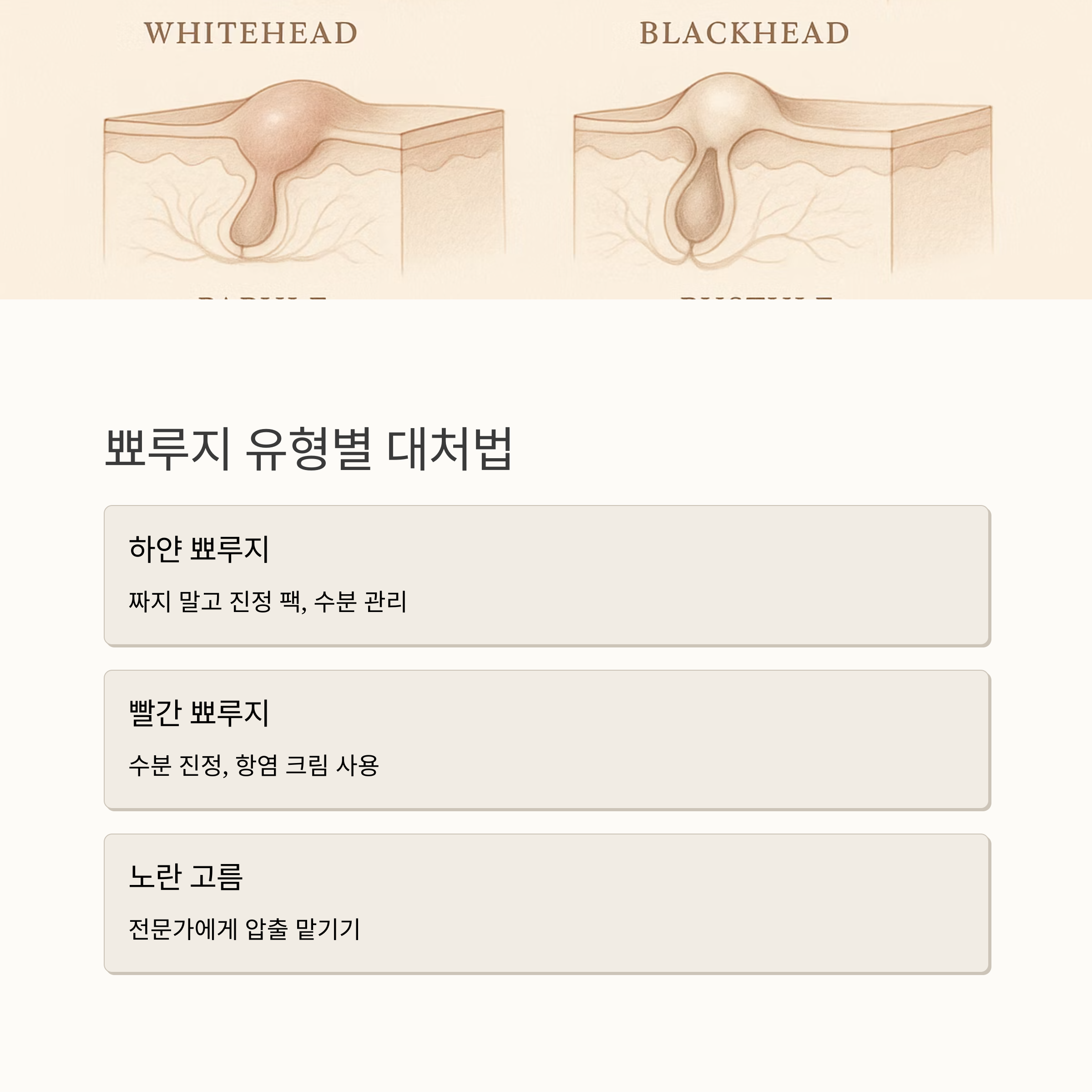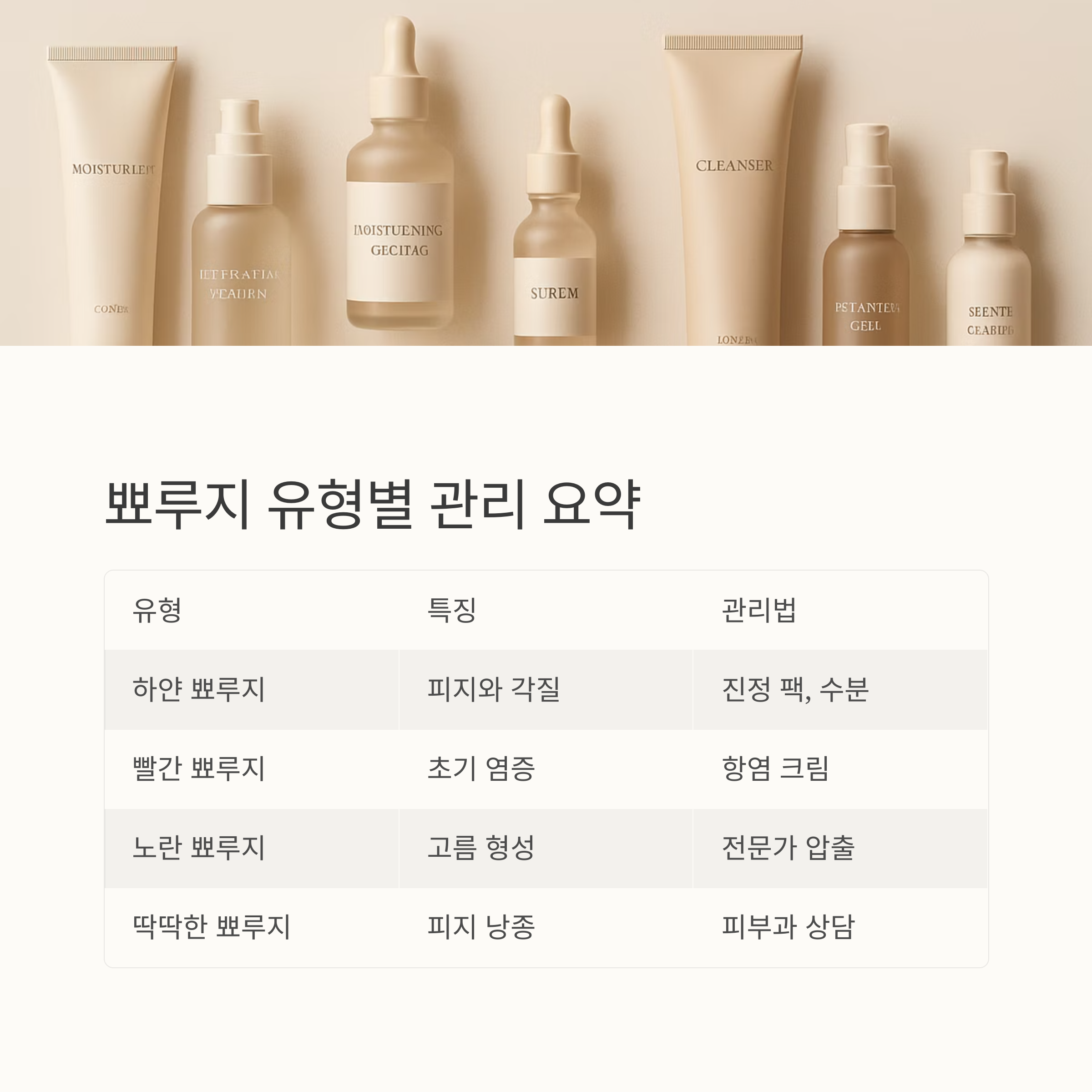 뾰루지는 종류가 다양해요. 하얗게 봉긋하게 올라온 뾰루지는 피지와 각질이 뭉쳐서 생긴 거고, 빨갛게 부어오른 뾰루지는 염증이 시작된 거예요. 노랗게 고름이 잡힌 뾰루지는 고름 형태의 염증이고, 딱딱한 뾰루지는 피지 낭종일 가능성이 높아요.