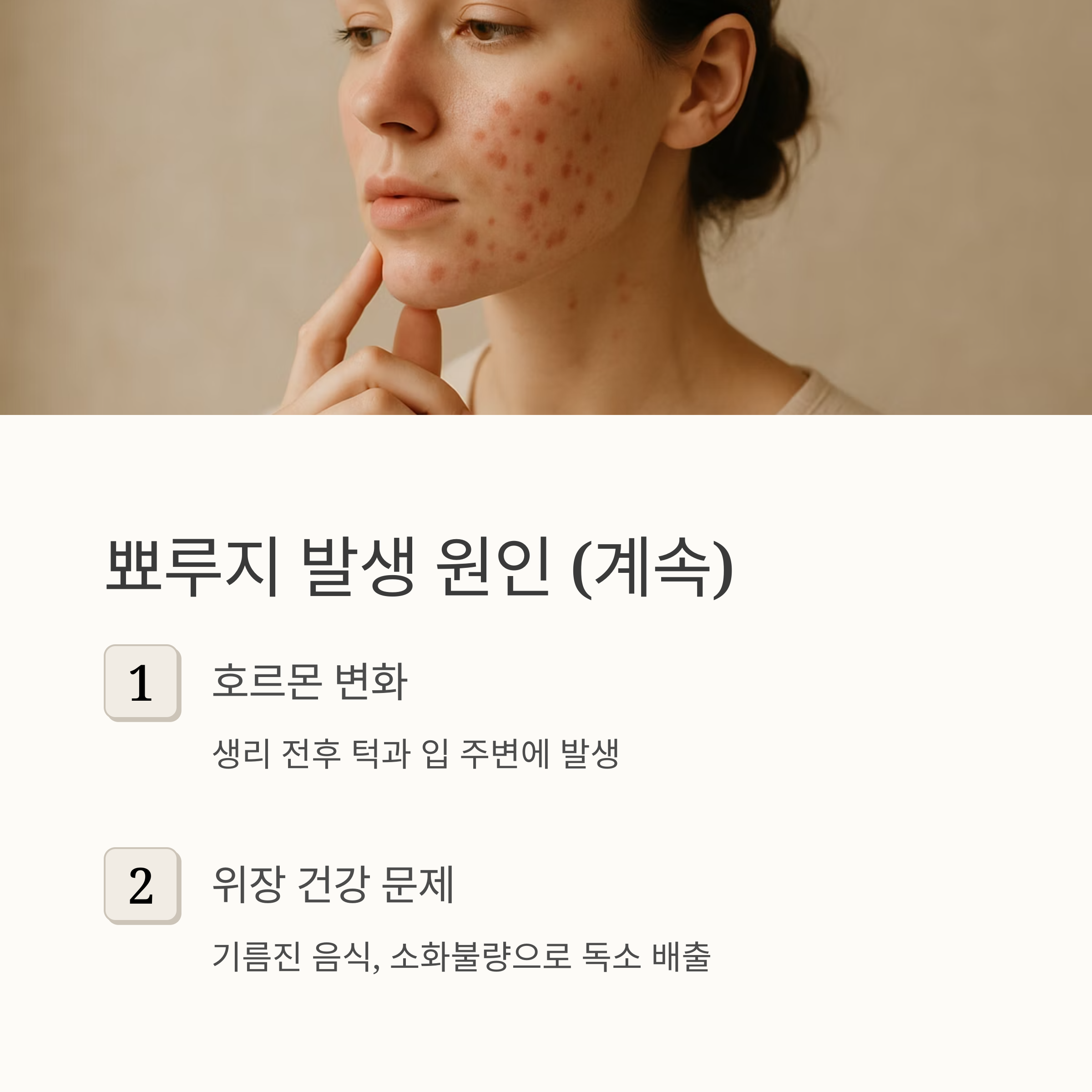 손에는 정말 많은 세균이 있거든요. 핸드폰이나 베개, 심지어 손톱에도 세균이 숨어있을 수 있답니다. 세 번째는 스트레스와 수면 부족이에요. 스트레스 받으면 호르몬 균형이 깨지면서 피부 재생 능력이 떨어져 뾰루지가 잘 생겨요. 네 번째는 여성분들에게 흔한 원인인데 바로 생리 전 호르몬 변화예요.
